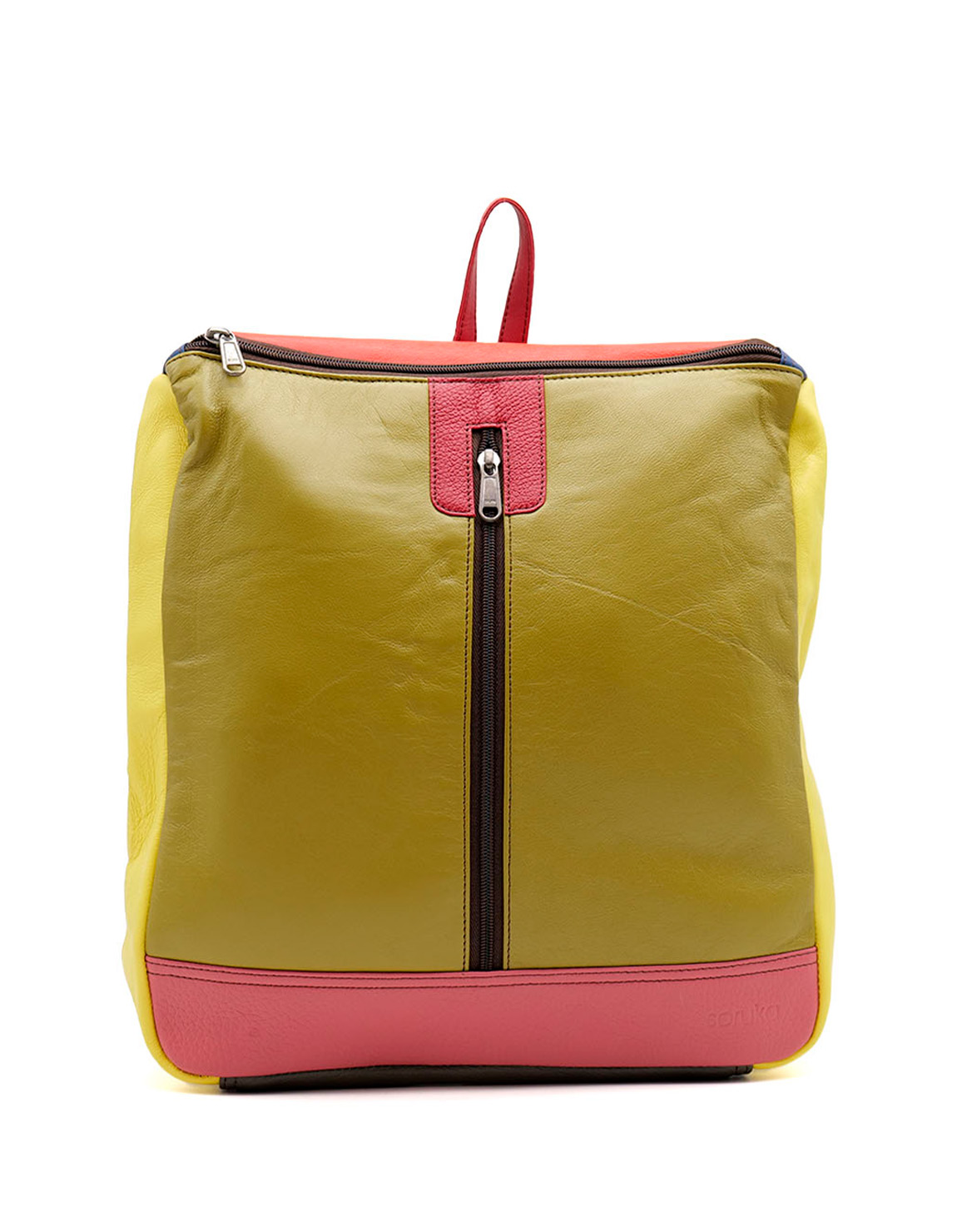 100% Recycled Leather Backpack in solid colors. Beautiful Eco-friendly Handmade Bag in Shades of Green and Pink.