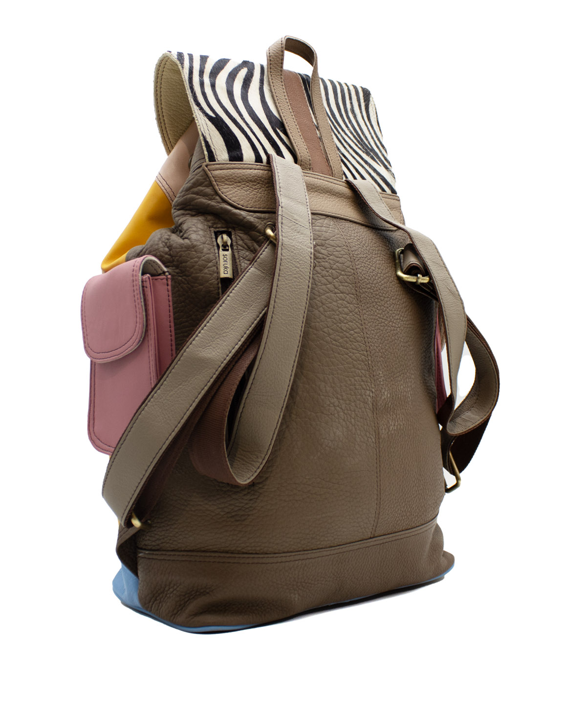 100% Upcycled Leather Backpack. Multicolor Eco friendly Handmade Backpack with animal print and in shades of Blue and Yellow.