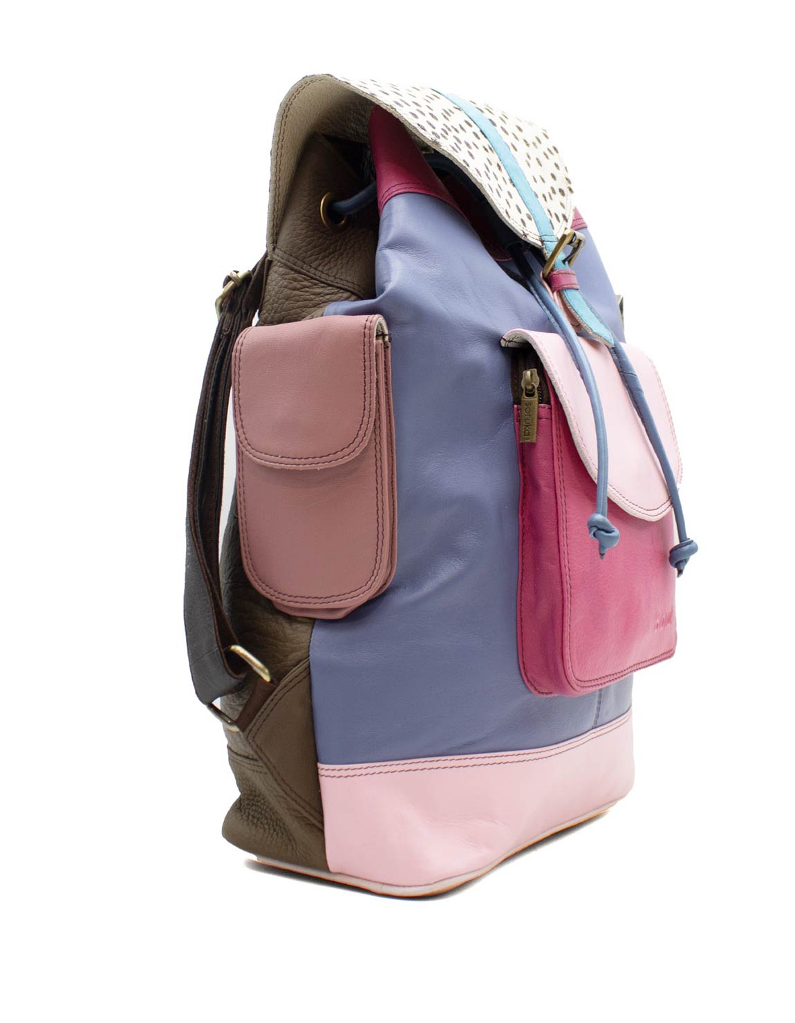 The bag comes with a large main compartment and fastens with two cute thick leather laces under the flap. There is a large main pocket in the front of the bag and two additional pockets on each side that close with a magnetic stud beneath the flap. Additional pocket zipper inside the main compartment and long vertical outside zipper pocket on the back for your phone or to secure any items. Adjustable leather straps and top handle strap.