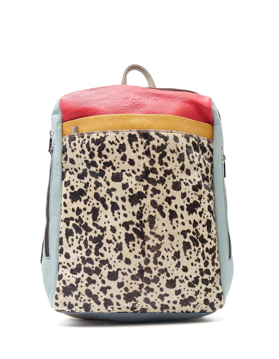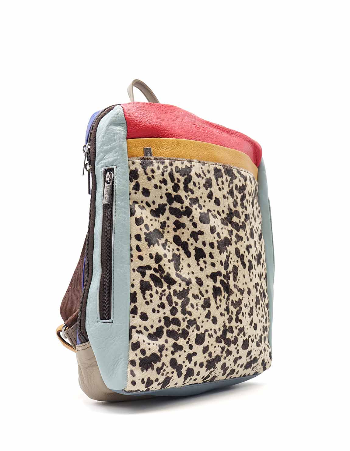 100% Recycled Leather Backpack with Aniamal Print. Beautiful Eco-friendly Handmade Laptop Bag in Shades of Red, Light Blue and with Animal Print.