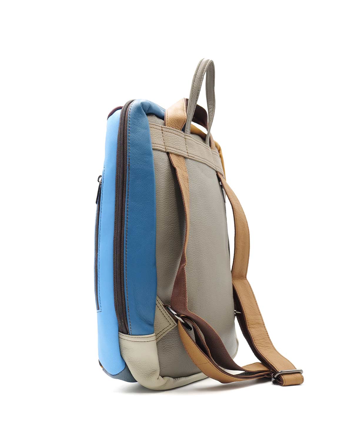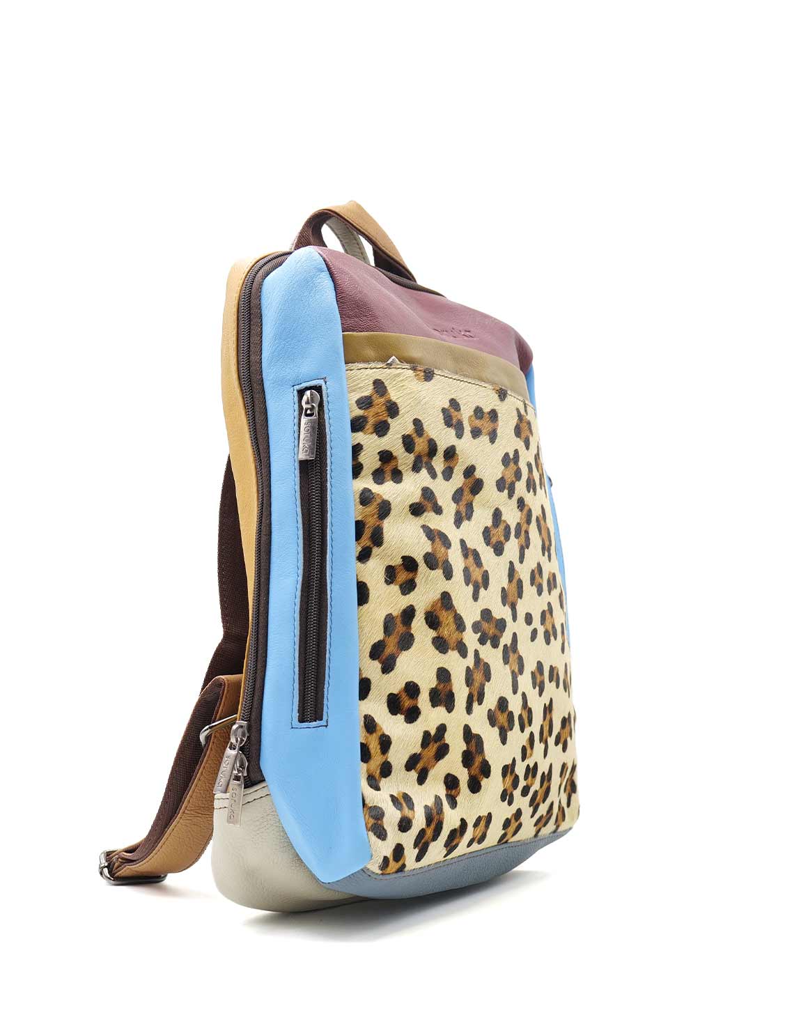 100% Recycled Leather Backpack with Aniamal Print. Beautiful Eco-friendly Handmade Laptop Bag in Shades of Brown, Blue and with Animal Print.