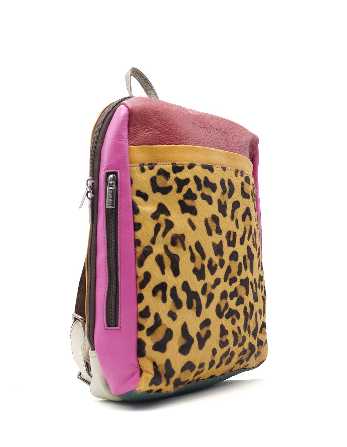 100% Recycled Leather Backpack with Aniamal Print. Beautiful Eco-friendly Handmade Laptop Bag in Shades of Burgundy, Pink and with Animal Print.