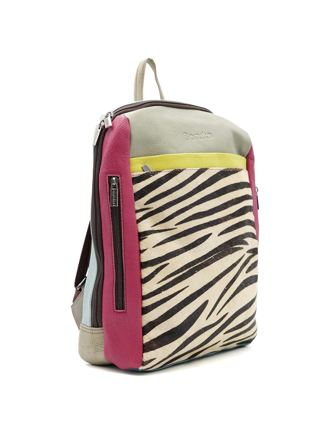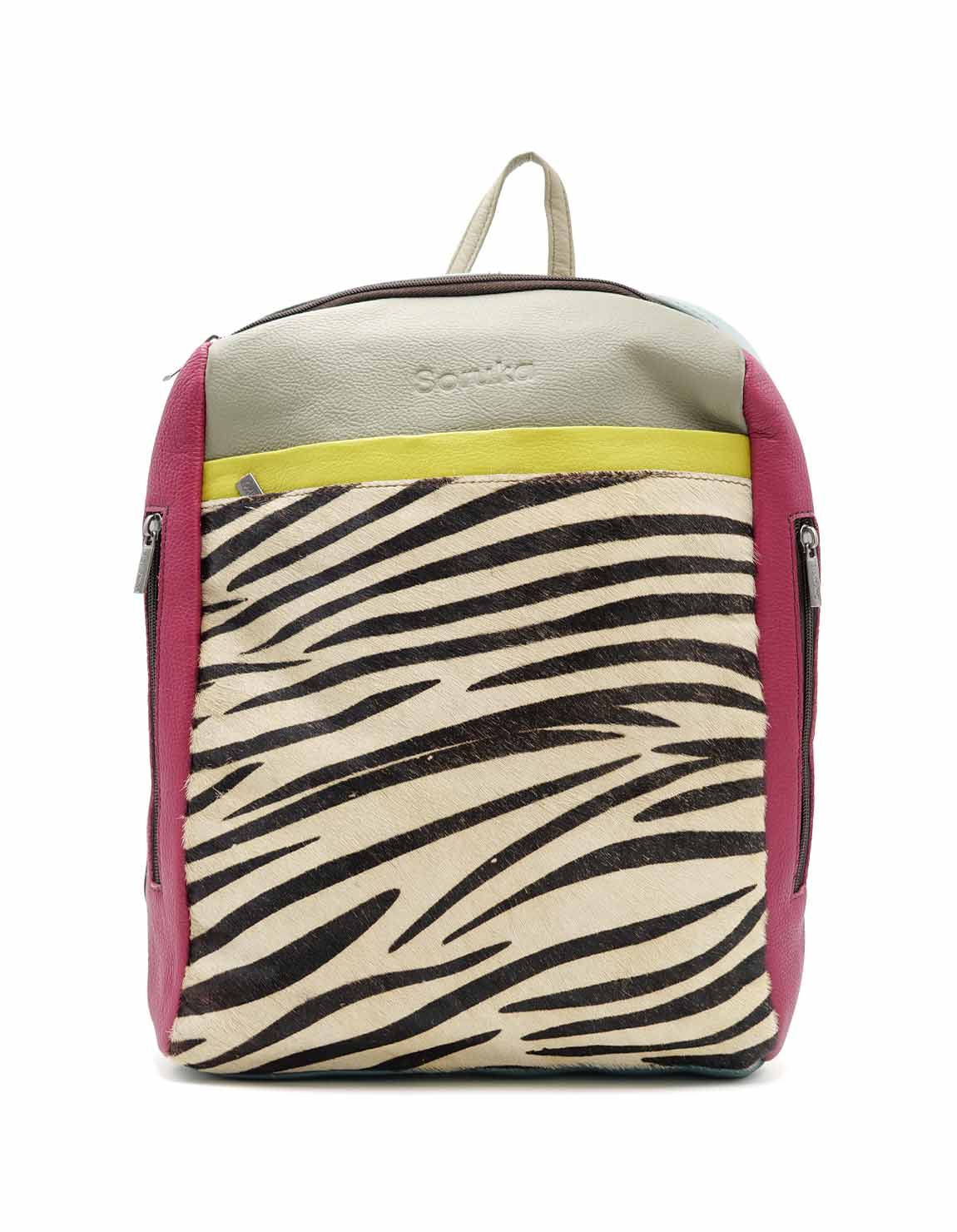 100% Recycled Leather Backpack with Aniamal Print. Beautiful Eco-friendly Handmade Laptop Bag in Shades of Pink, Light Green and with Animal Print.