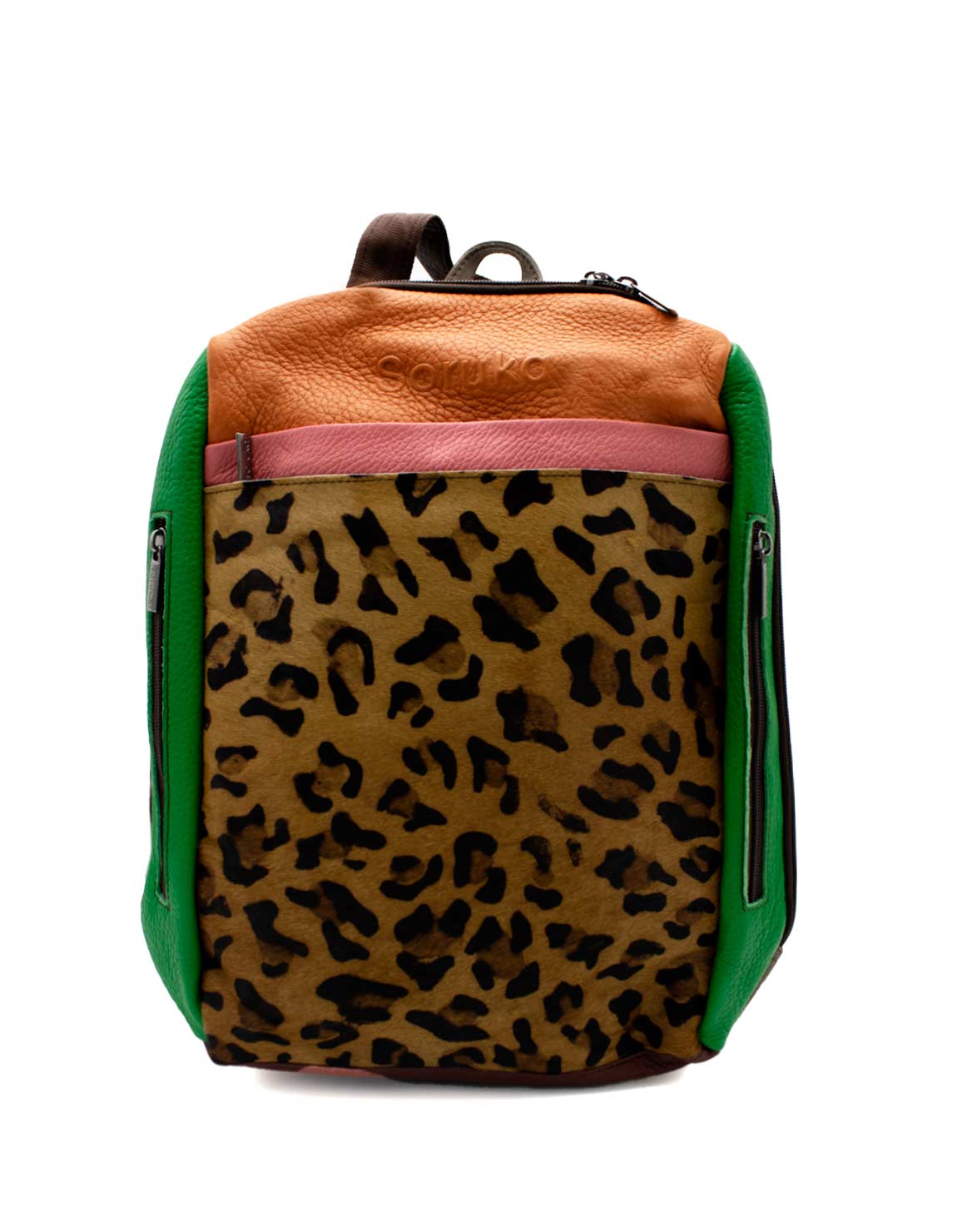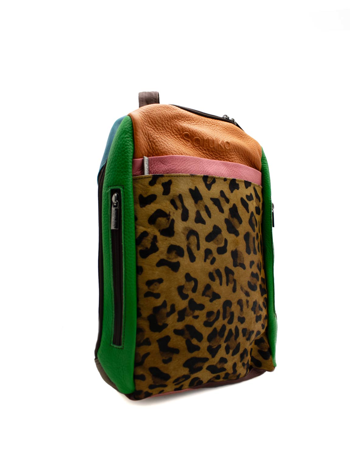 100% Recycled Leather Backpack with Aniamal Print. Beautiful Eco-friendly Handmade Laptop Bag in Shades of Green, Orange and with Animal Print.