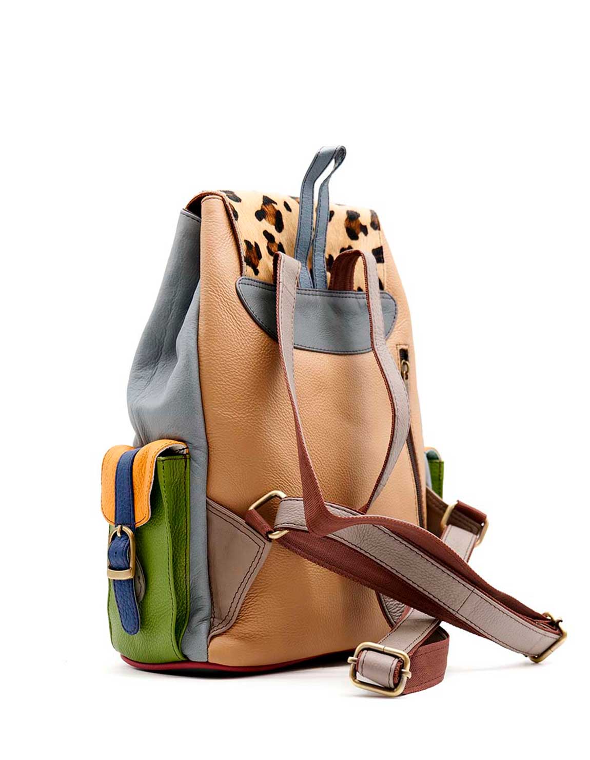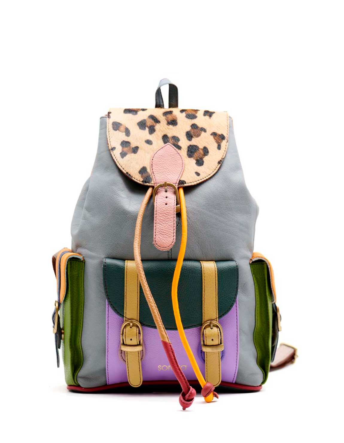 100% Upcycled Leather Backpack. Multicolor Eco-friendly Handmade Backpack in Shades of Gray with Animal print flap.