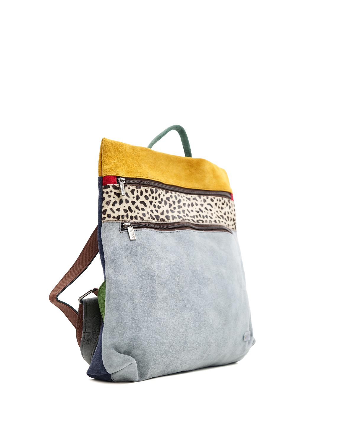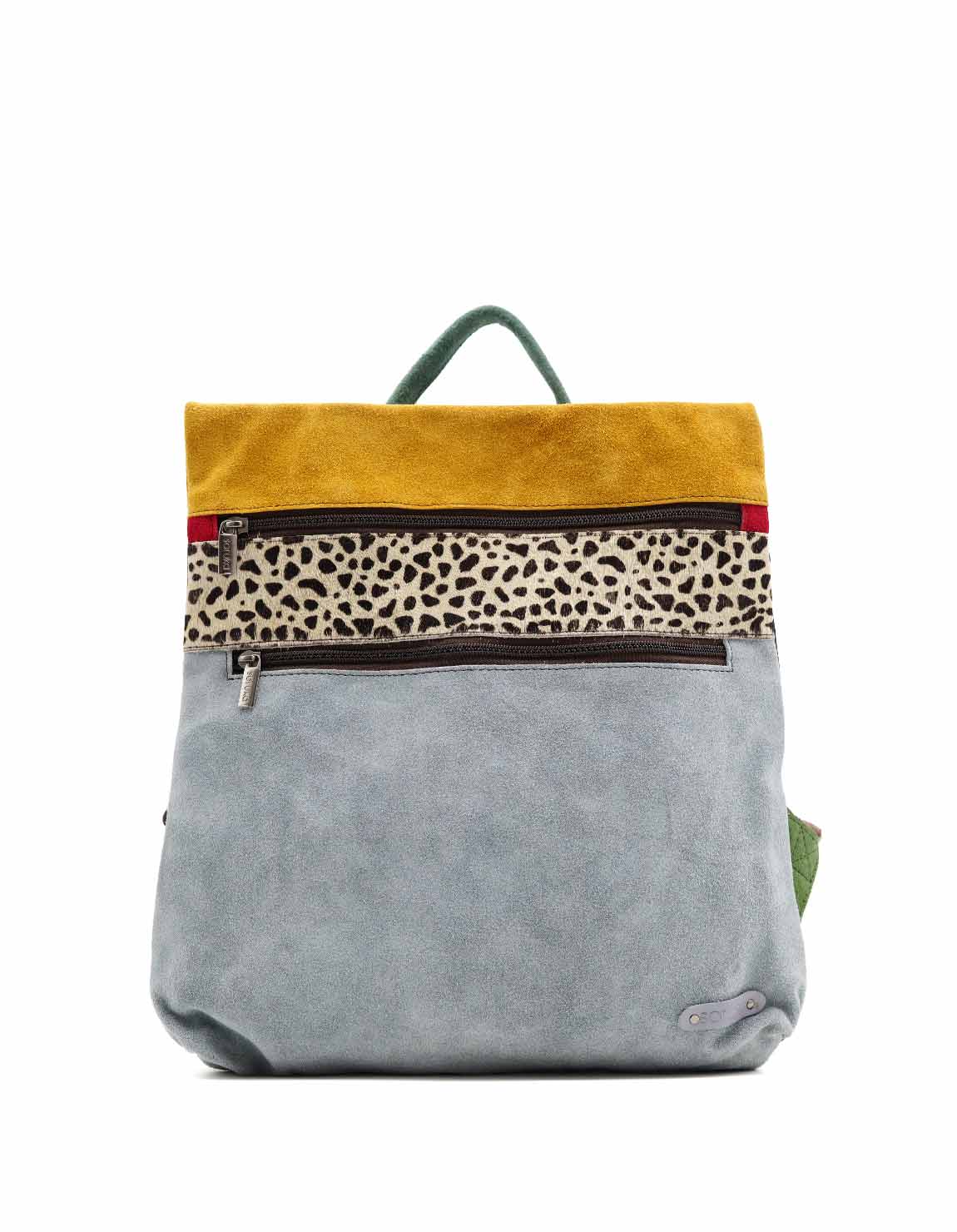 100% Suede Recycled Leather Backpack. Beautiful Eco-friendly Backpack in Shades of Gray, Yellow and with Animal Print.
