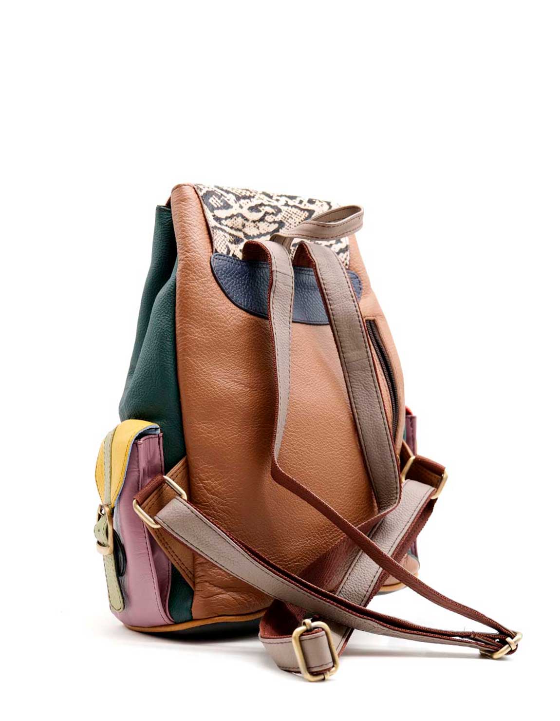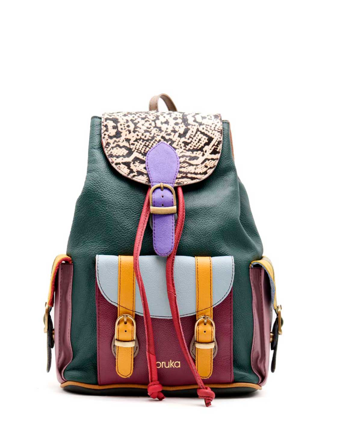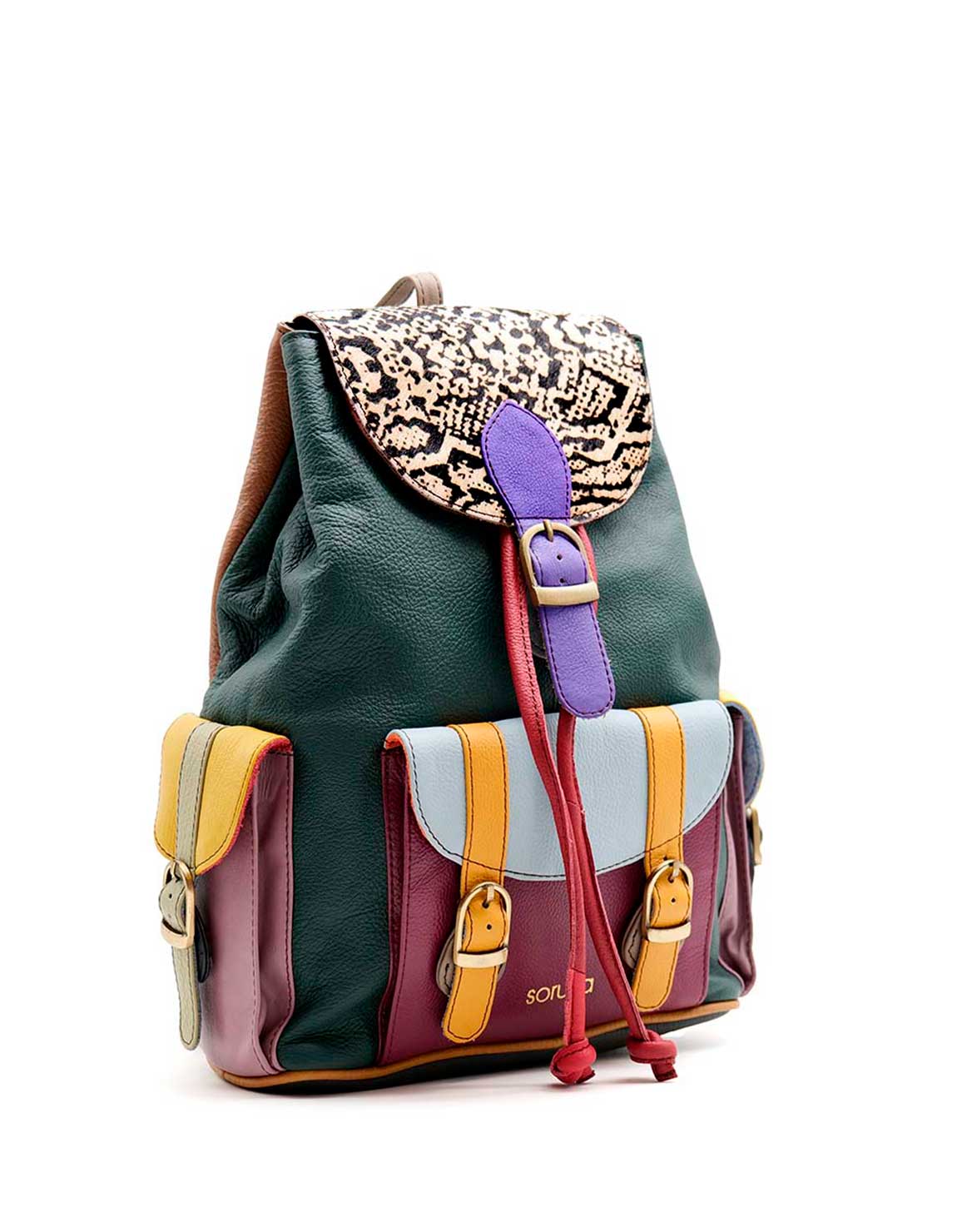 100% Upcycled Leather Backpack. Multicolor Eco-friendly Handmade Backpack in Shades of Green with Animal print flap.