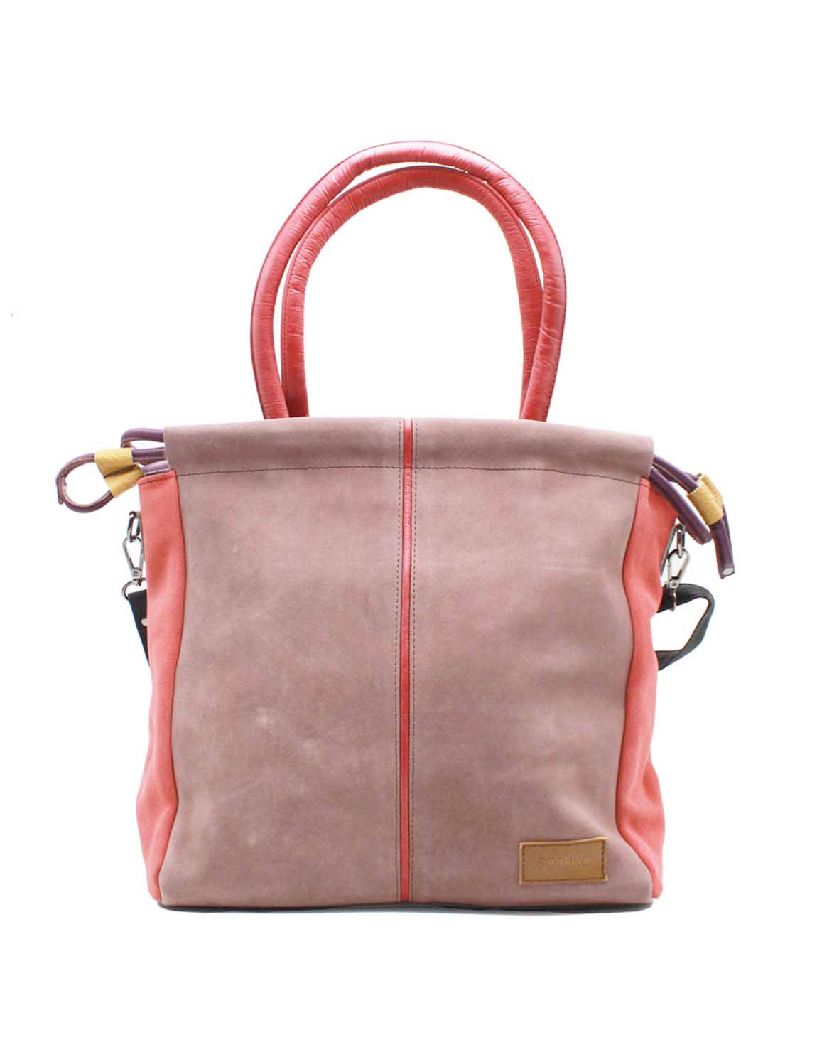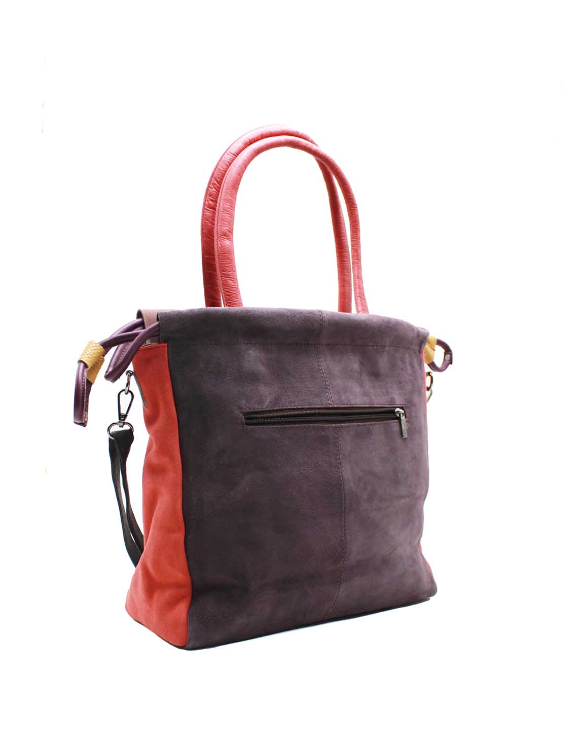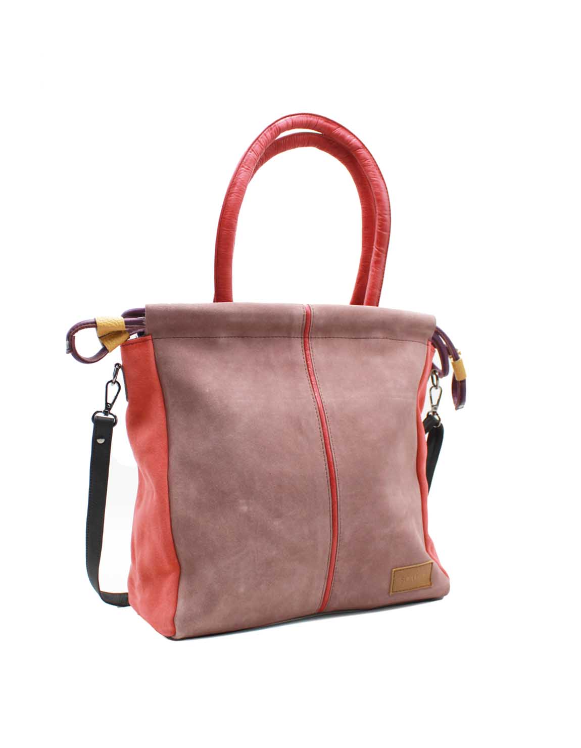 Women’s shoulder bag · Two-tone recycled leather · Handmade · Double handles and adjustable shoulder strap · Suede Leahter