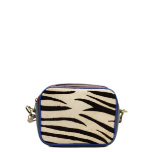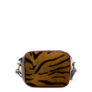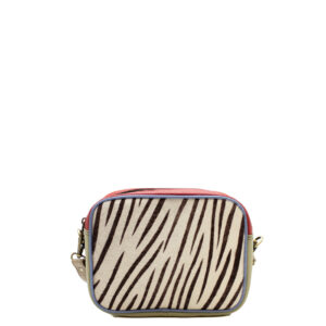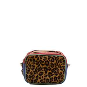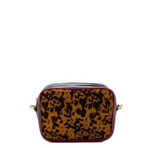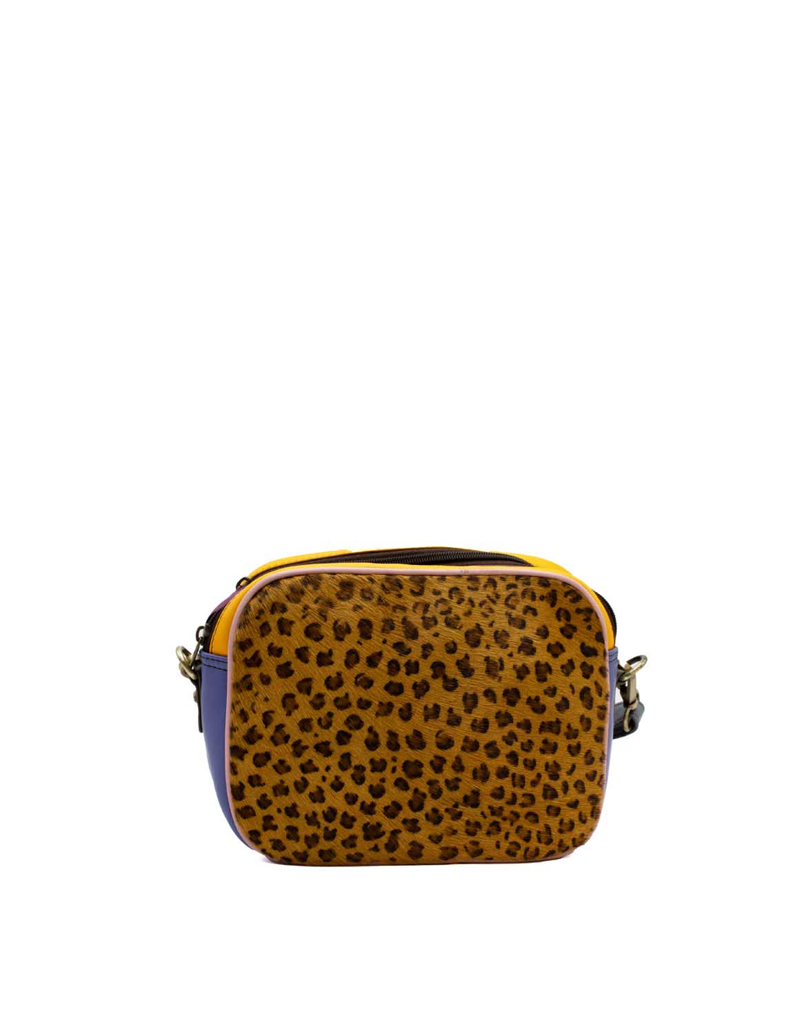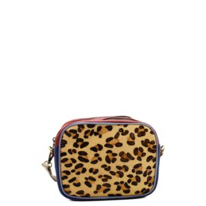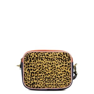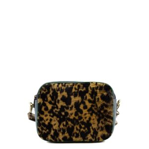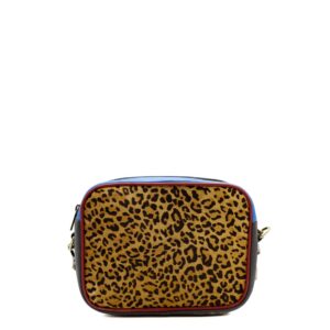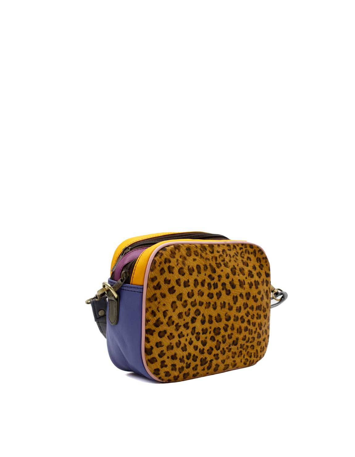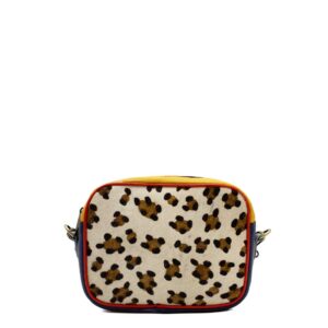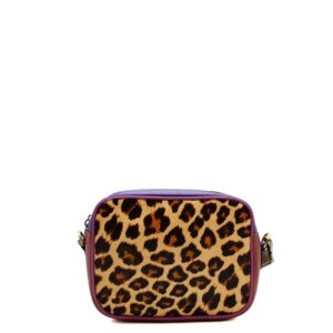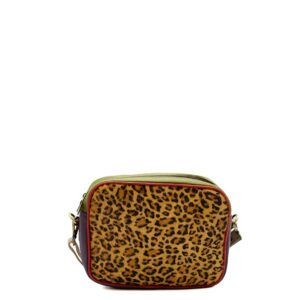 Make a statement with this eye-catching animal print, crossbody bag, crafted from recycled leather for a unique and sustainable touch. Its compact, yet spacious design, features two separate zipper compartments, ensuring you stay effortlessly organized on the go.