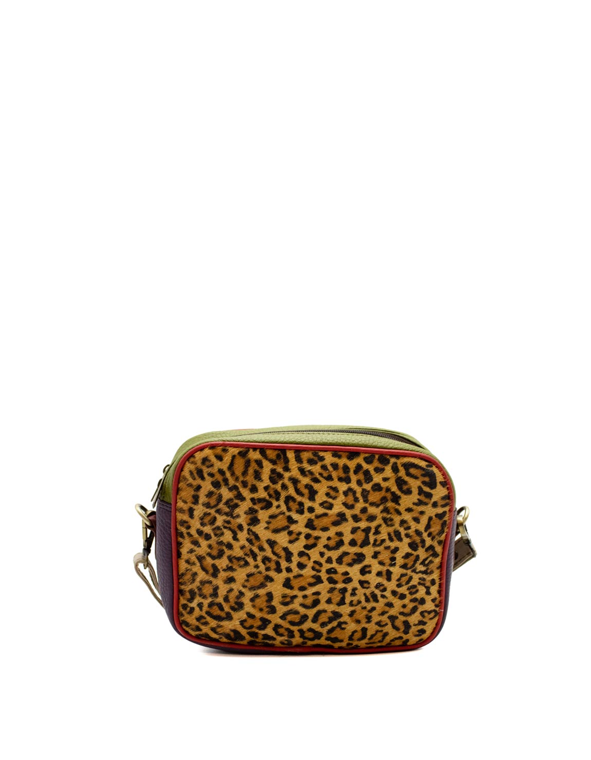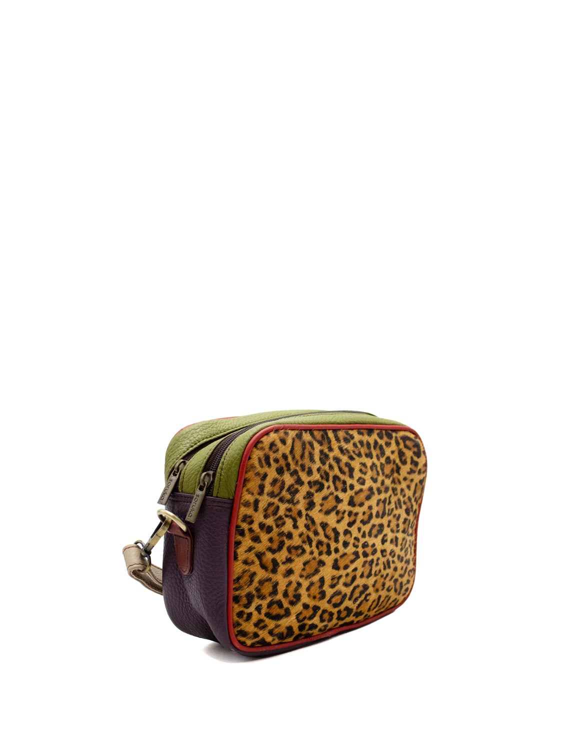 Make a statement with this eye-catching animal print, crossbody bag, crafted from recycled leather for a unique and sustainable touch. Its compact, yet spacious design, features two separate zipper compartments, ensuring you stay effortlessly organized on the go.
