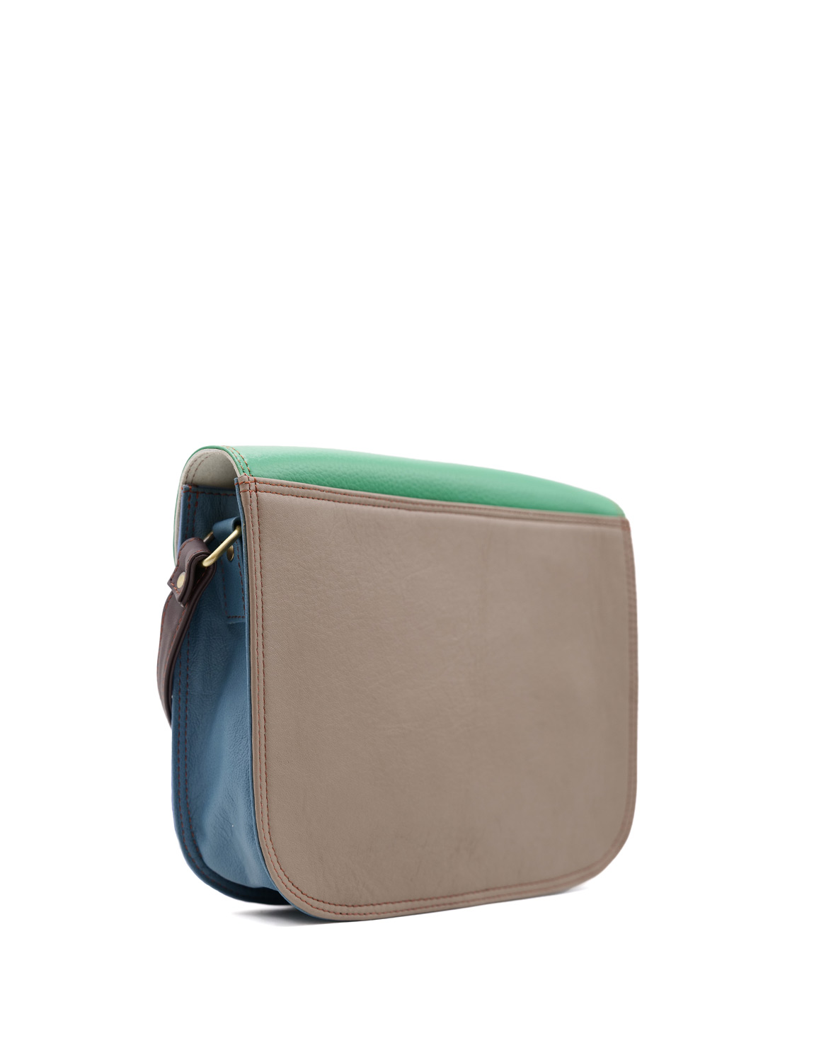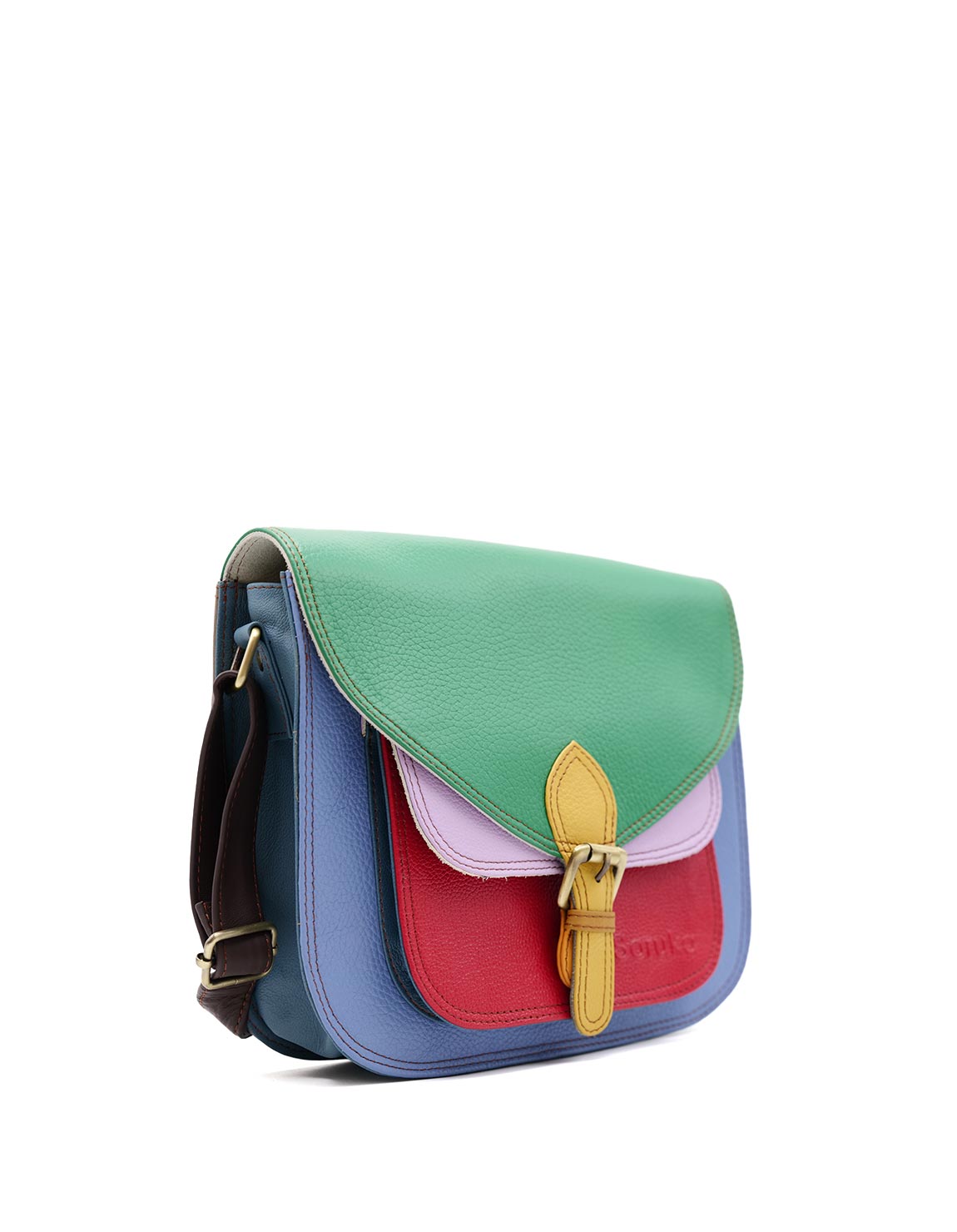 Beautiful 100% Recycled Leather Shoulder Bag in Shades of Blue, Green and Red. Eco-friendly Handmade Bag. Adjustable shoulder strap also in leather.