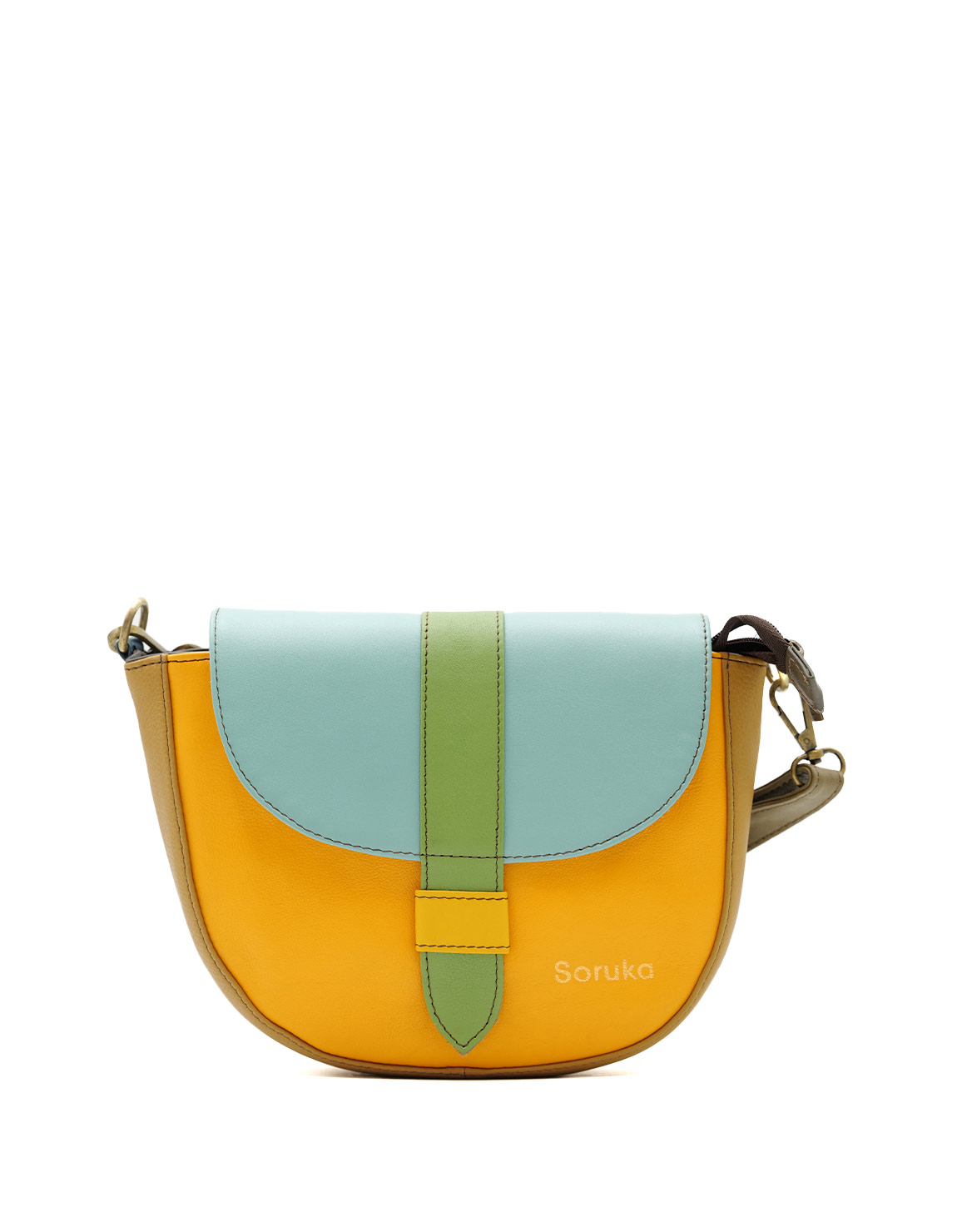 This colorful medium saddle-shaped bag is unique and will definitely make a statement when you wear it. Perfect size to fit all your everyday items.