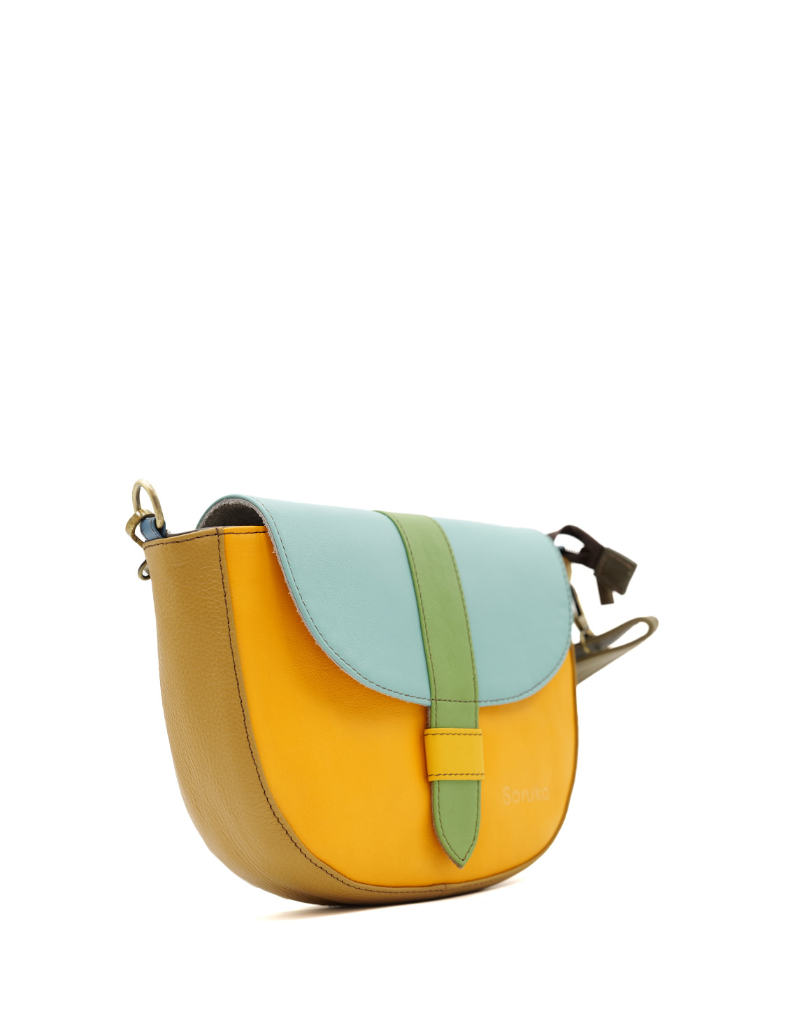 Beautiful 100% Recycled Leather Crossbody Shoulder Bag. Eco-friendly Handmade Bag in Shades of Yellow and Blue.
