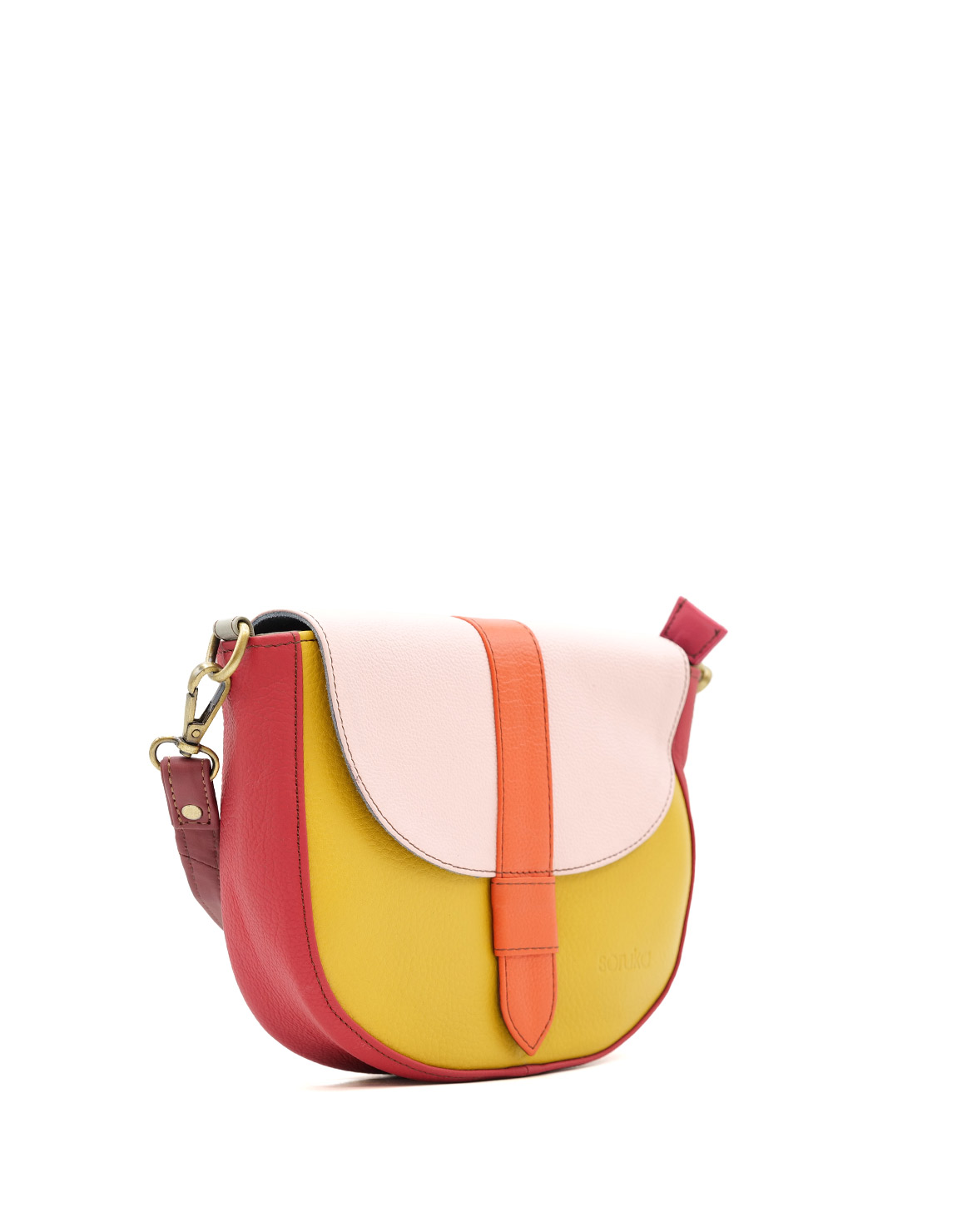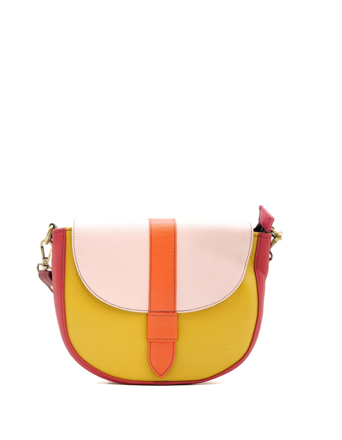 This colorful medium saddle-shaped bag is unique and will definitely make a statement when you wear it. Perfect size to fit all your everyday items.
