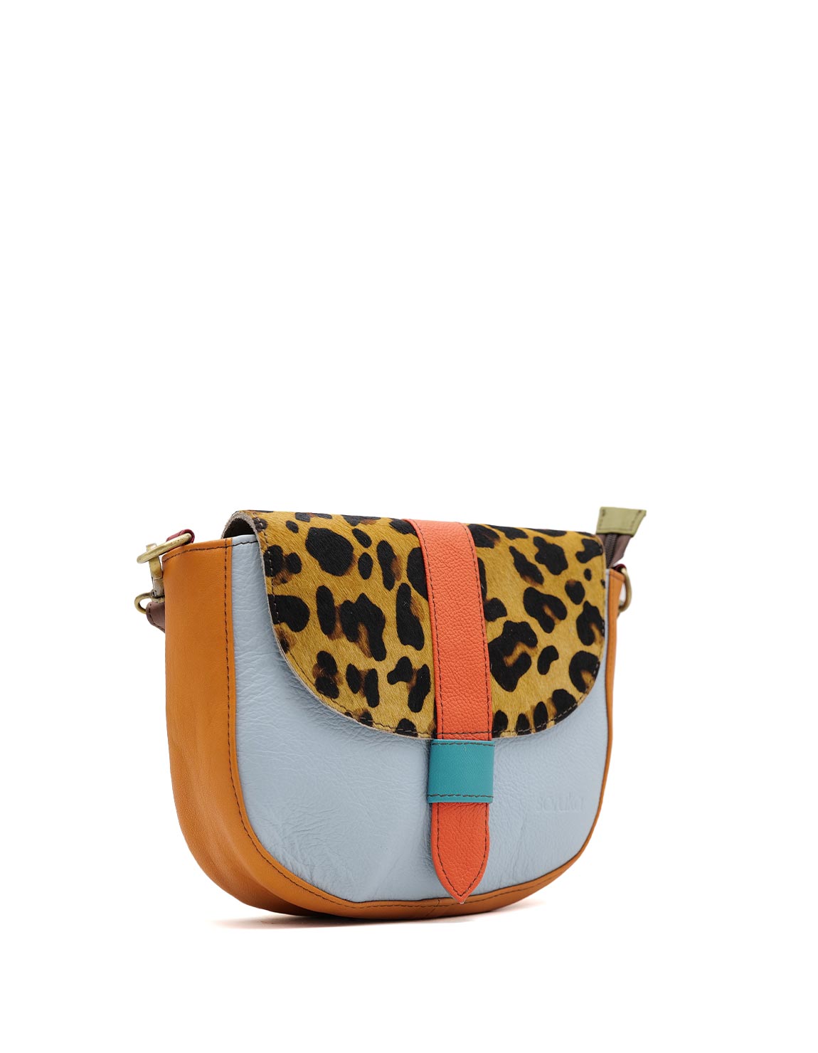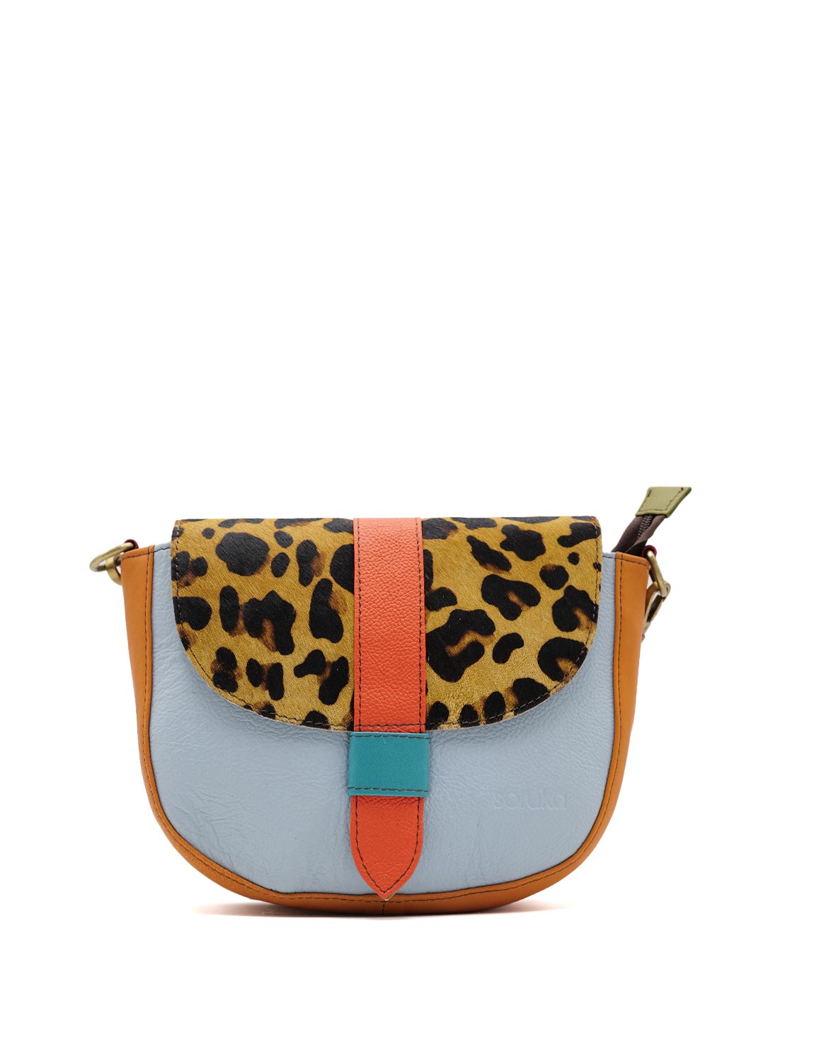 Beautiful 100% Recycled Leather Crossbody Shoulder Bag. Eco-friendly Handmade Bag in Shades of Light Blue and with Animal print flap.