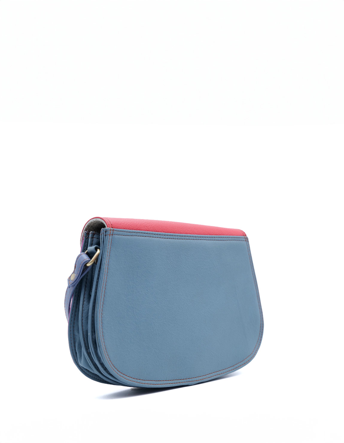 This colorful saddle-shaped bag is unique and compliments all types of looks. Great size to store all your essentials! It comes with three internal compartments, one with a zipper, a smaller front compartment with a magnetic stud and an outside zipper. Additional zipper pocket inside the main compartment