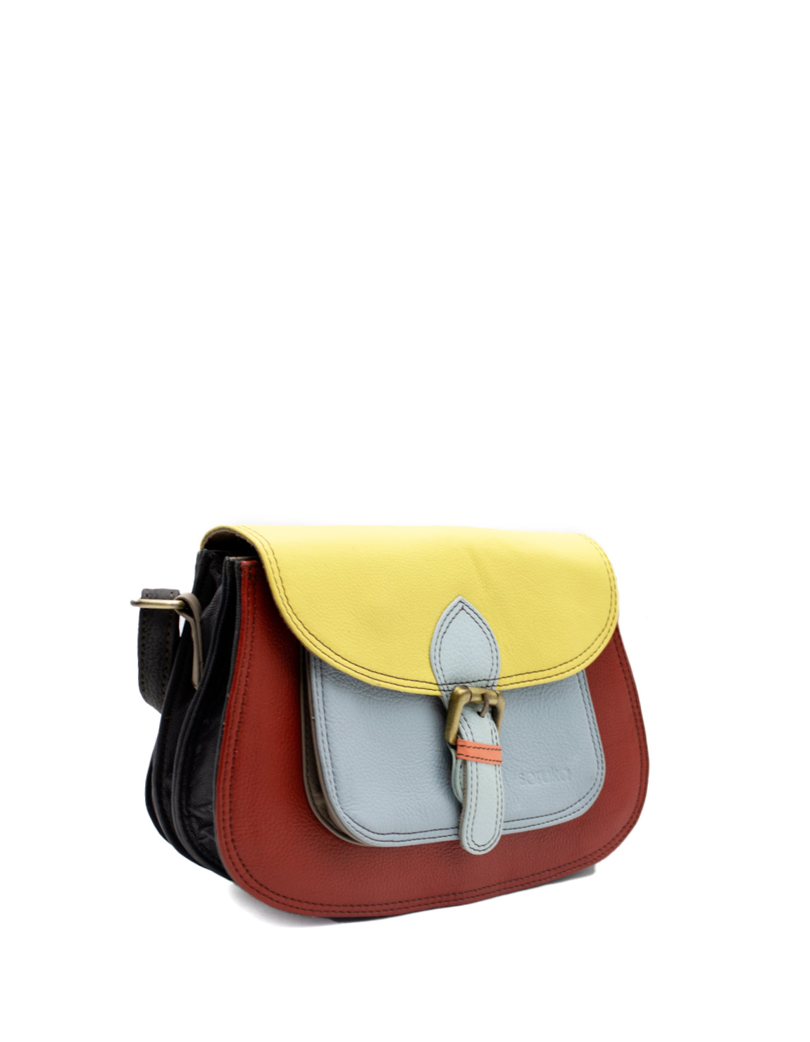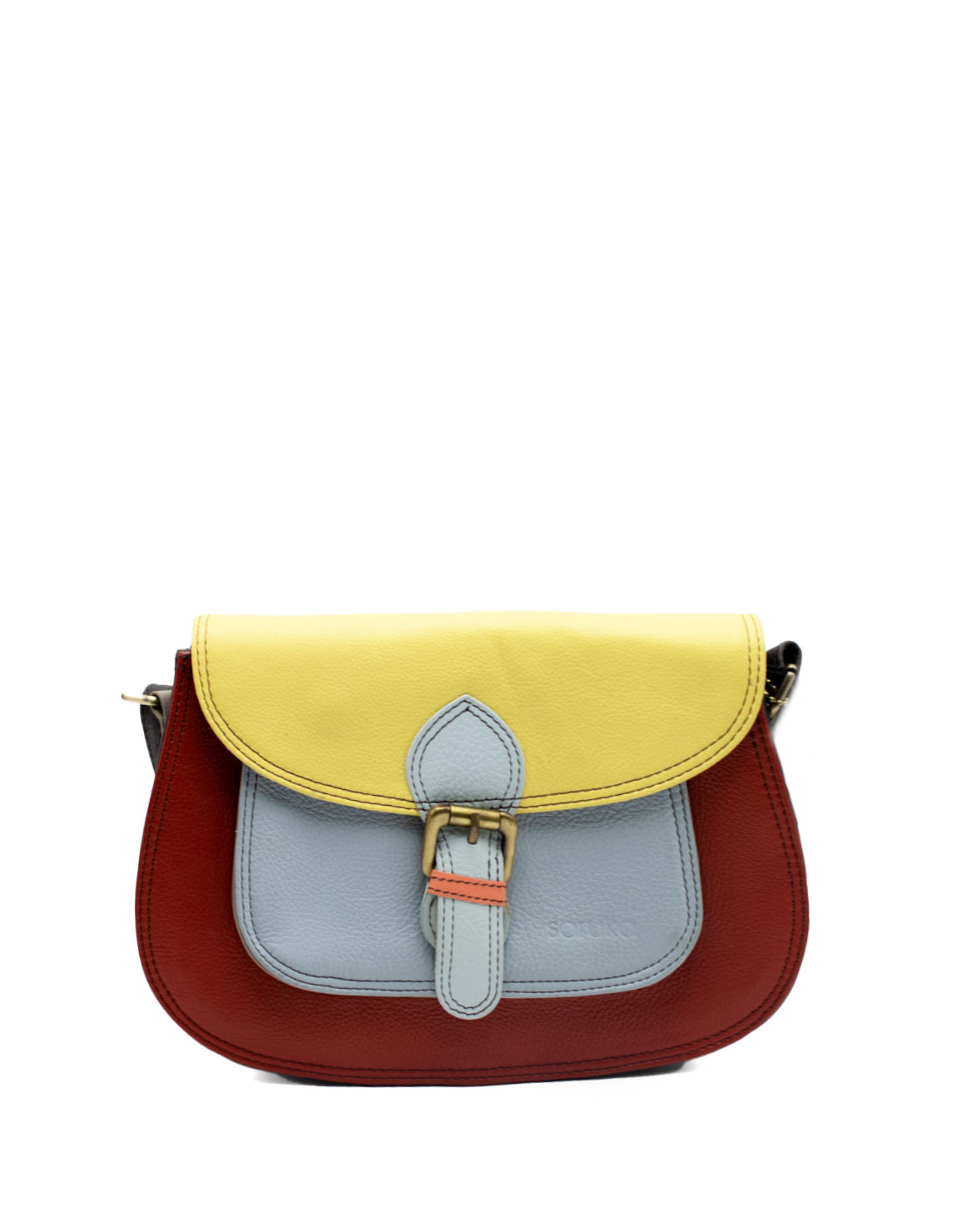 Beautiful 100% Recycled Leather Shoulder Bag and in Shades of Red, Light Blue and Yellow. Small Eco-friendly Crossbody Handmade Bag. Adjustable shoulder strap also in leather.
