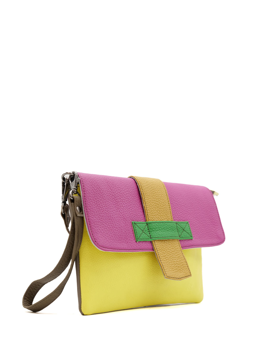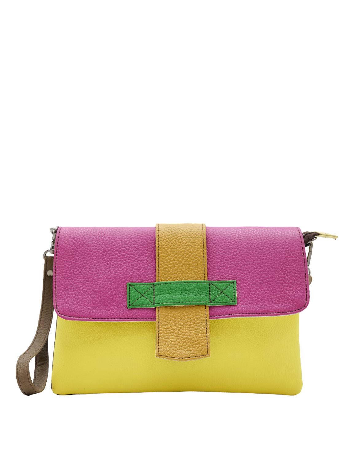Beautiful 100% Recycled Leather Croosbody Bag in Shades of Yellow and Pink. Eco-friendly Medium Crossbody Bag With 2-Colors Reversible Loop. Adjustable shoulder strap also in leather. Additional Wristlet Strap to Wear as a Clucth.