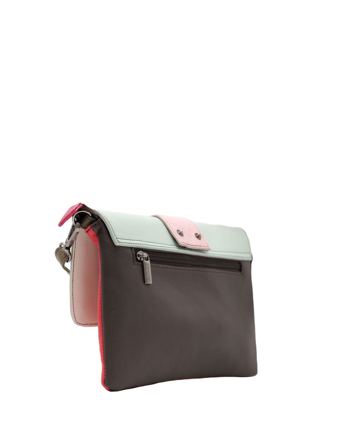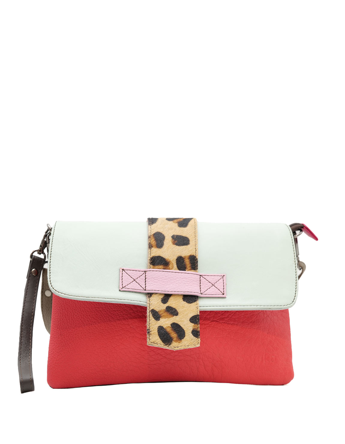 Beautiful 100% Recycled Leather Croosbody Bag in Shades of Red and Light Blue. Eco-friendly Medium Crossbody Bag With 2-Colors Reversible Loop. Adjustable shoulder strap also in leather. Additional Wristlet Strap to Wear as a Clucth.