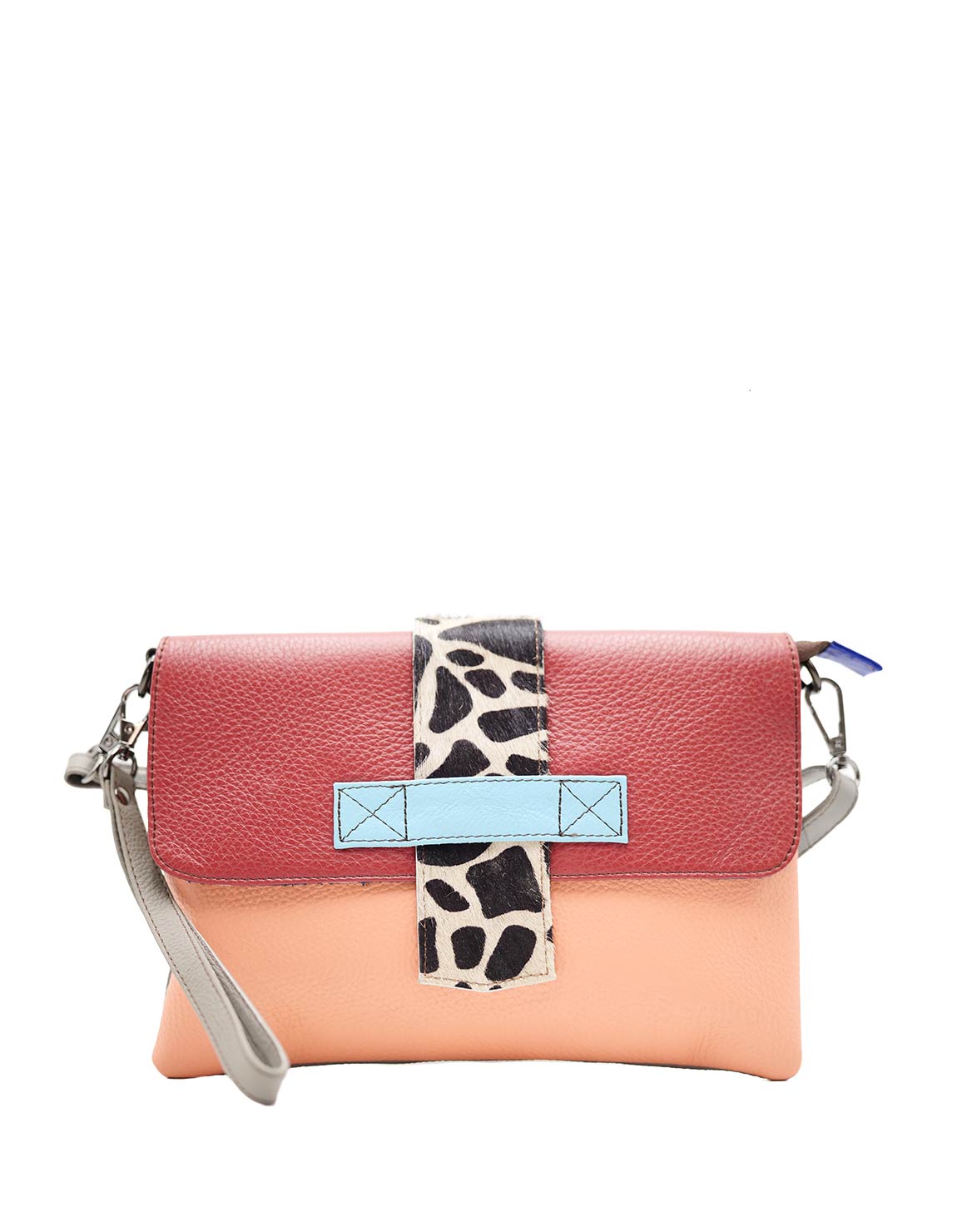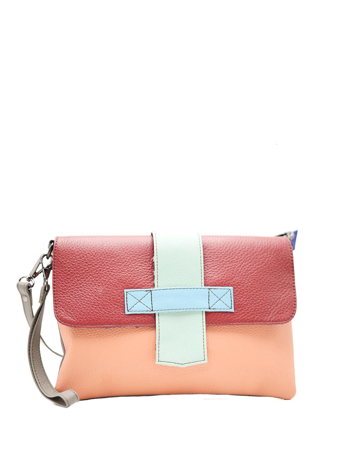 Beautiful 100% Recycled Leather Croosbody Bag in Shades of Pink and Red. Eco-friendly Medium Crossbody Bag With 2-Colors Reversible Loop. Adjustable shoulder strap also in leather. Additional Wristlet Strap to Wear as a Clucth.