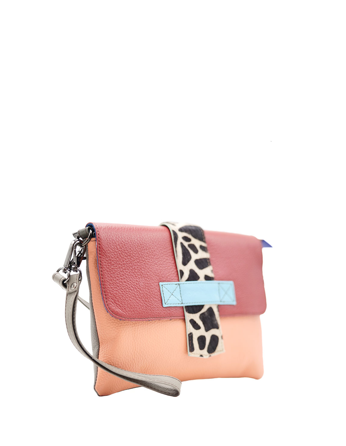 The bag comes with an adjustable shoulder/cross-body strap and additional wristlet strap. It fastens with a magnetic stud beneath the tie.