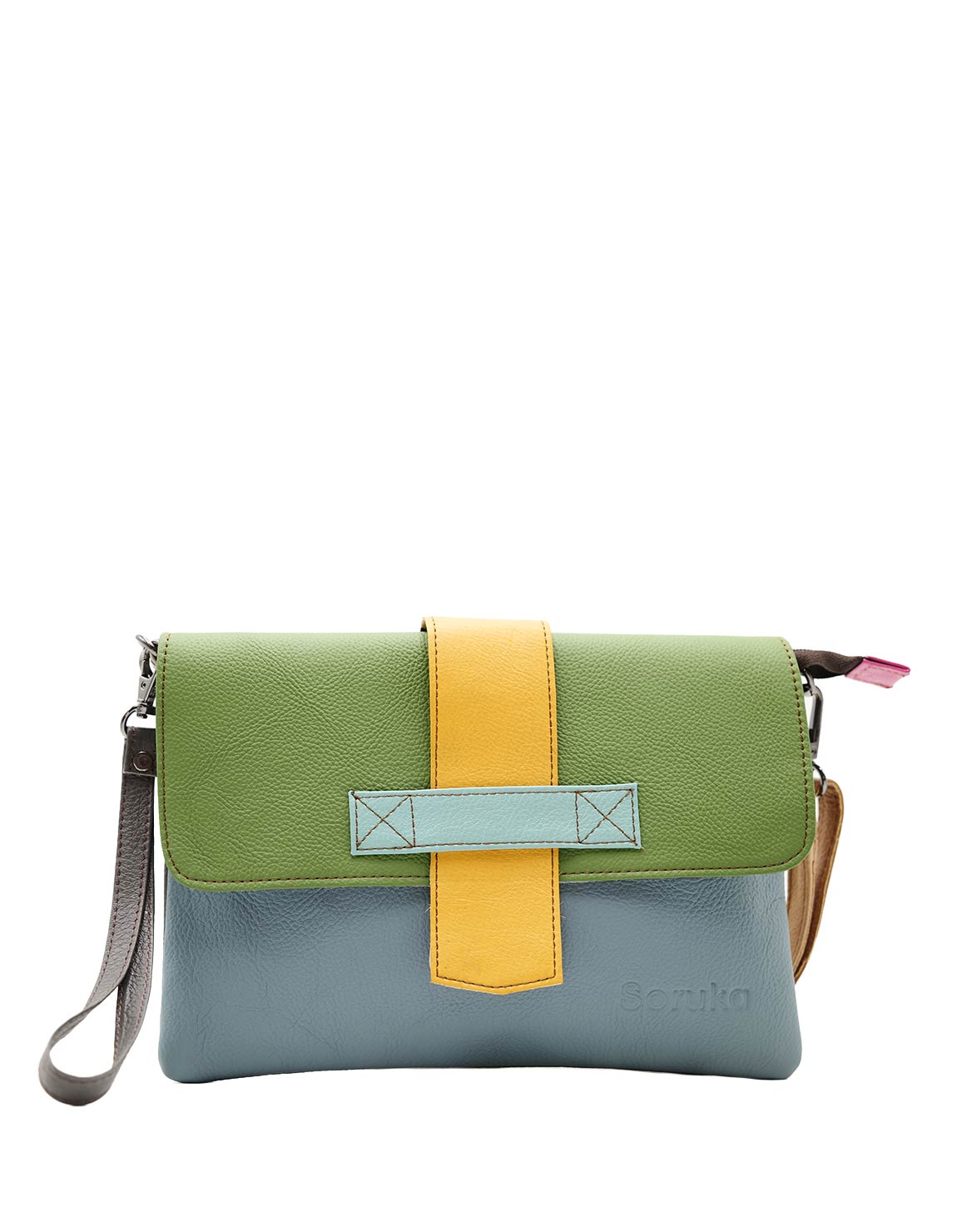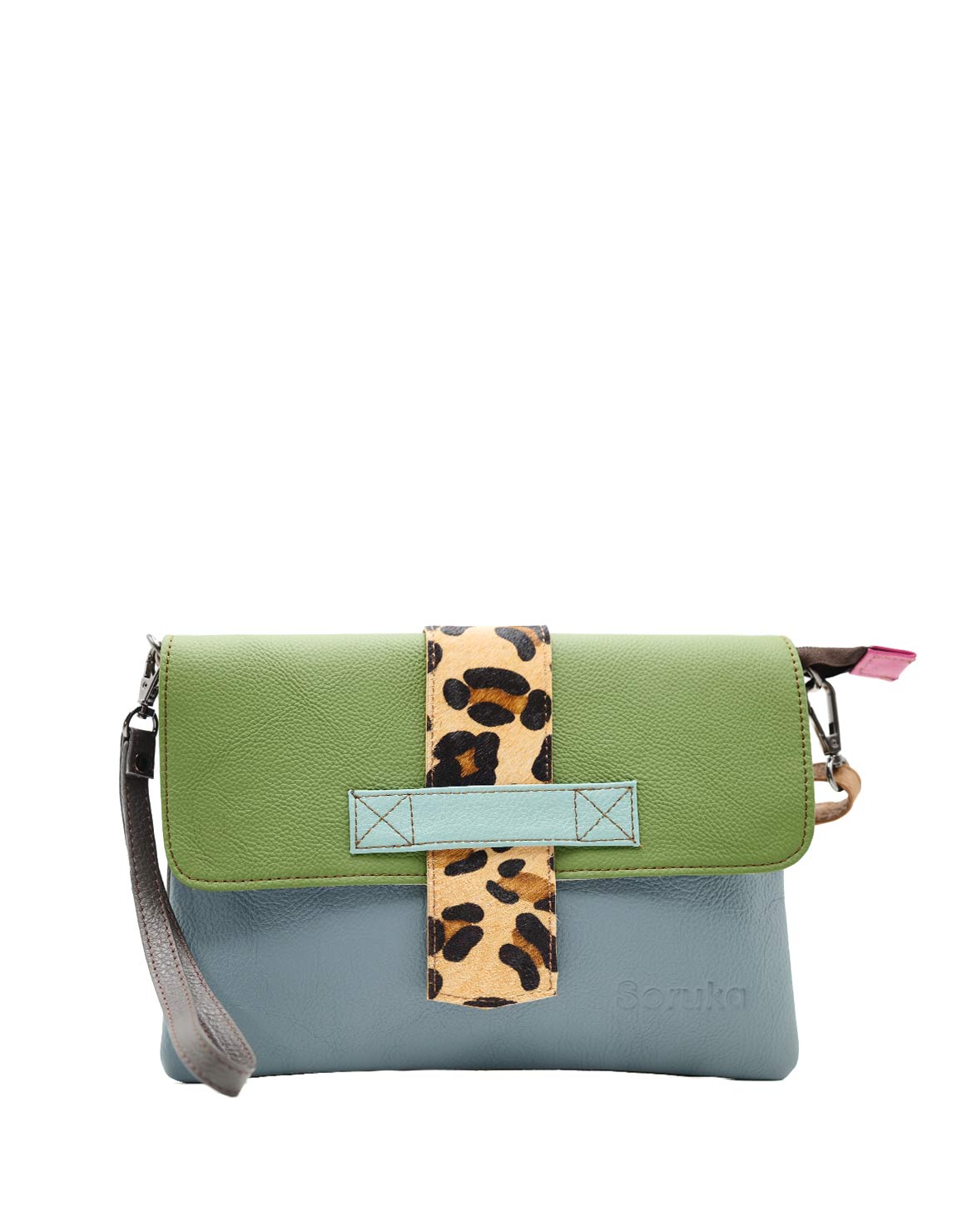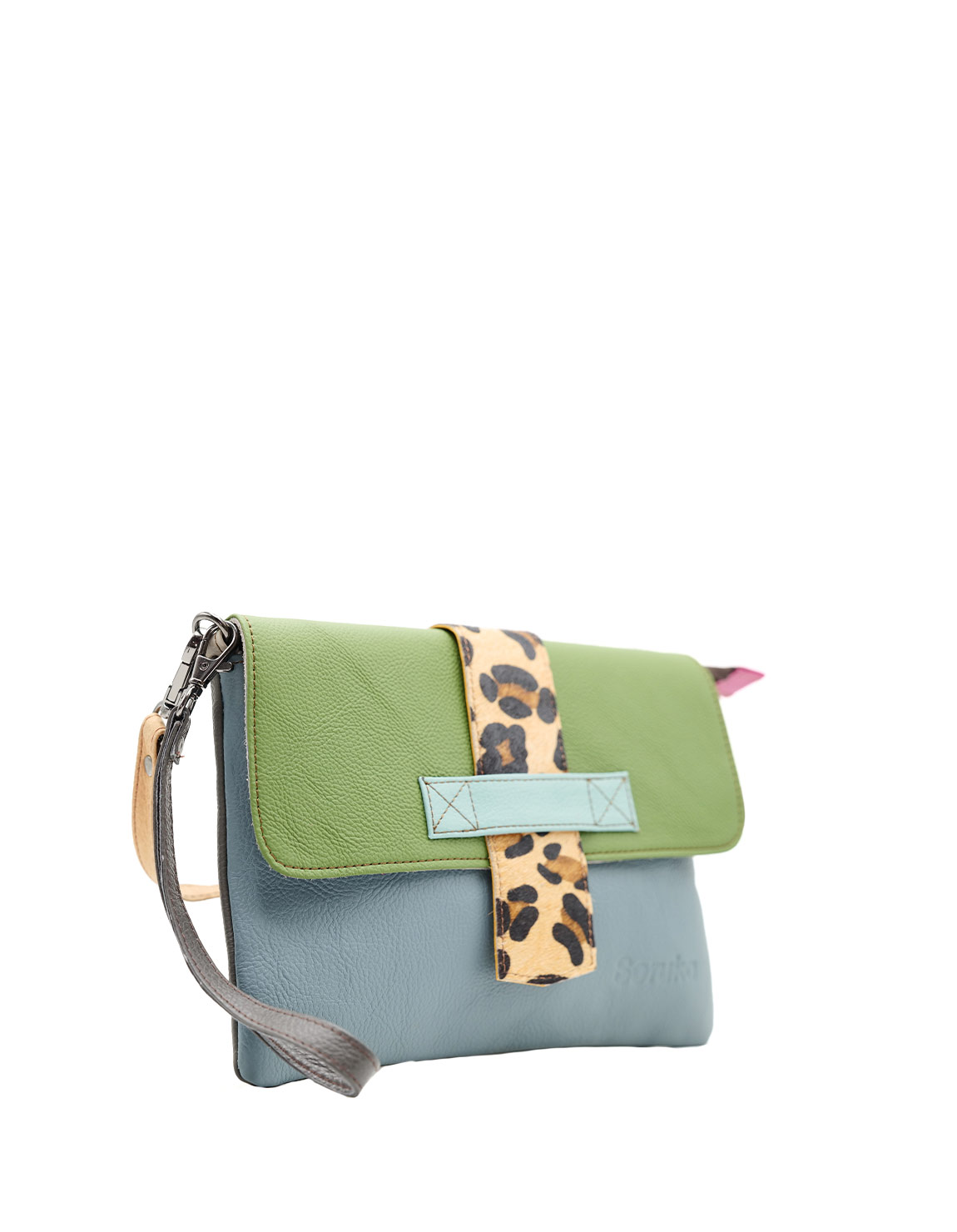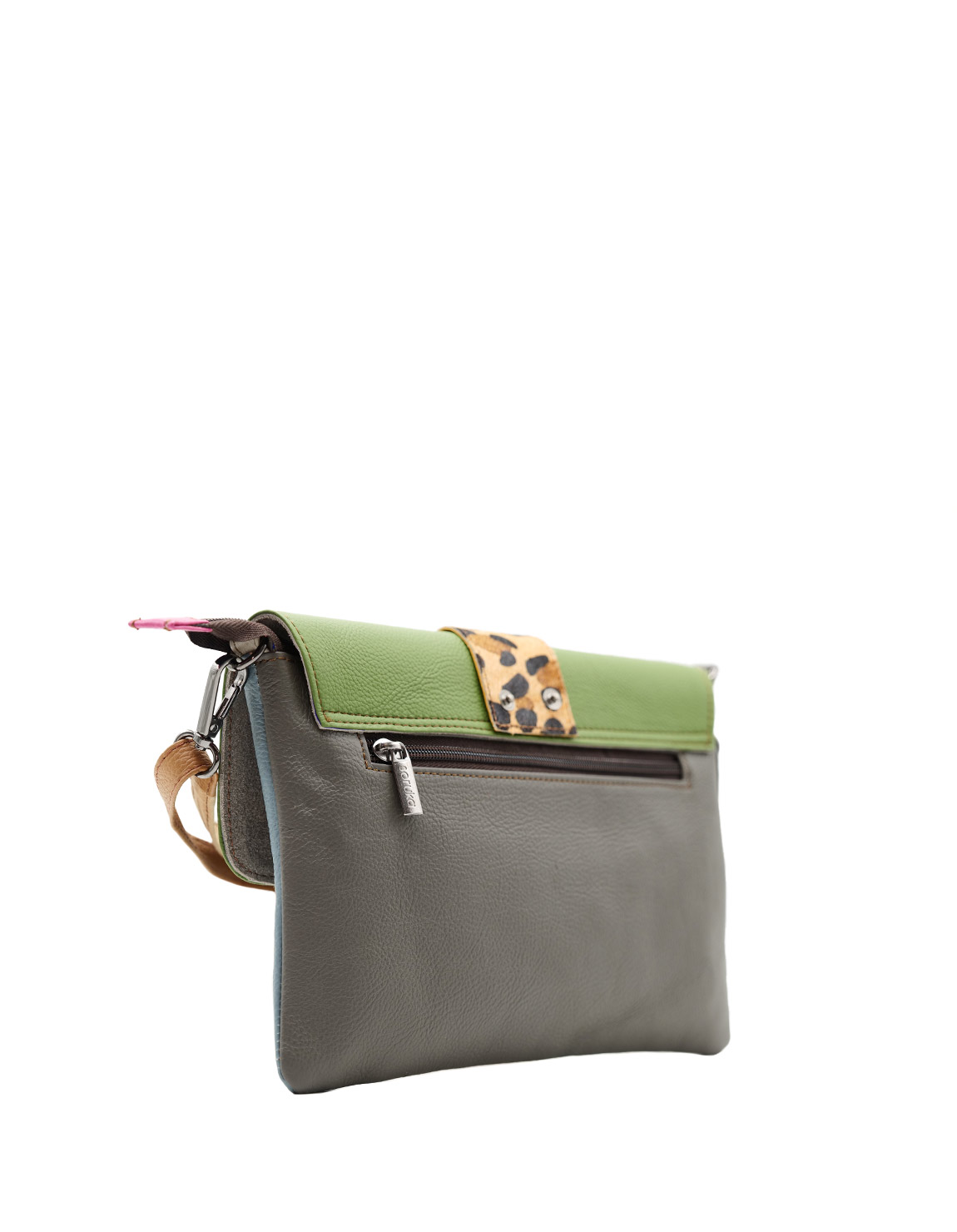 Beautiful 100% Recycled Leather Croosbody Bag in Shades of Gray and Green. Eco-friendly Medium Crossbody Bag With 2-Colors Reversible Loop. Adjustable shoulder strap also in leather. Additional Wristlet Strap to Wear as a Clucth.