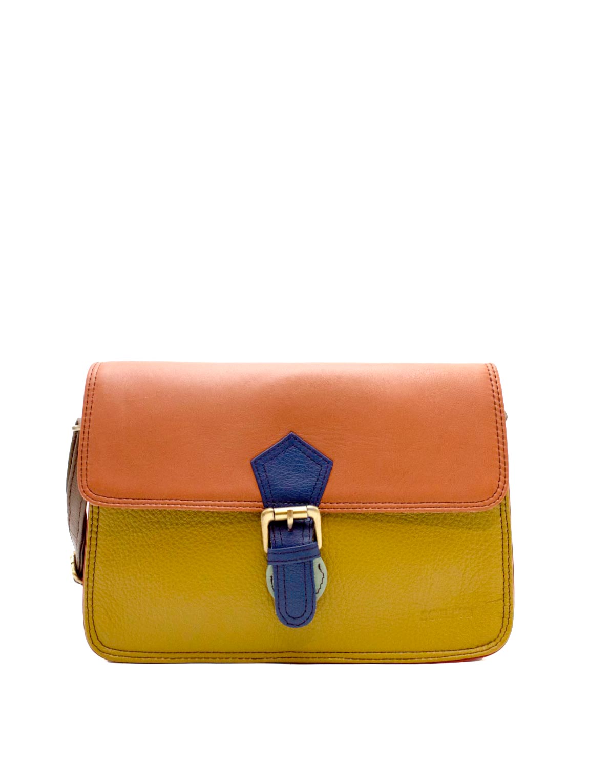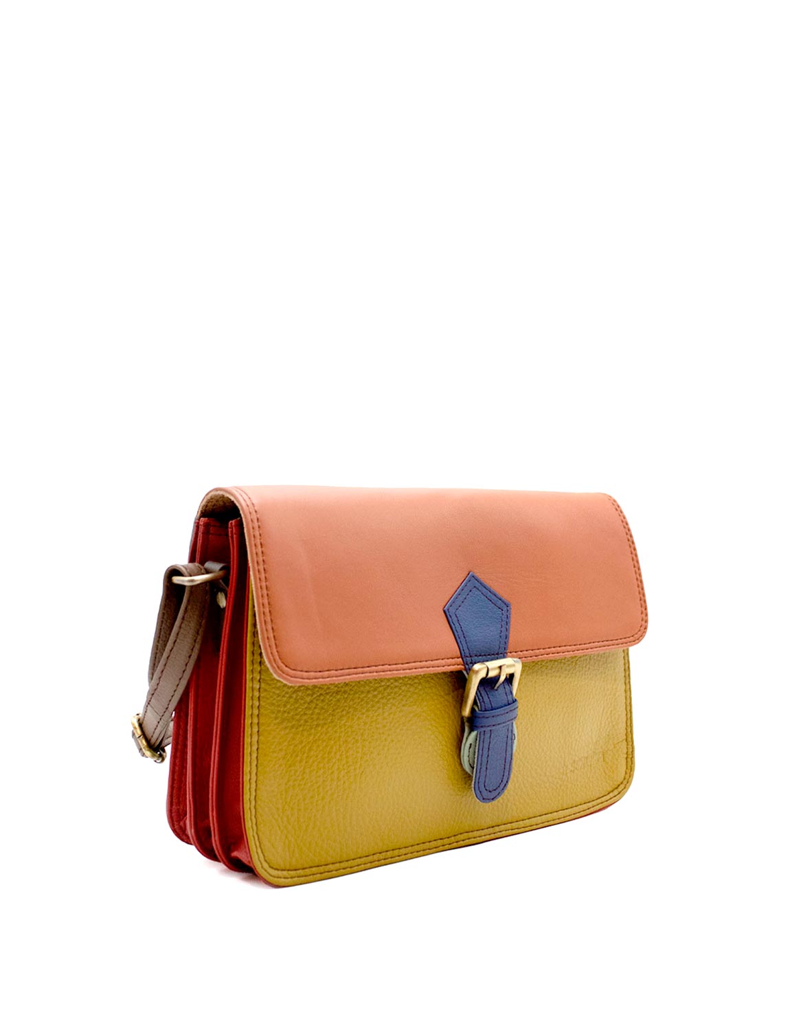 This colorful envelope-shaped saddle bag is unique and compliments all types of looks. Great medium-size crossbody to store all your essentials! The bag comes with an adjustable strap, also in leather, so it can be worn as a shoulder bag or crossbody. The purse comes with three internal compartments, one with a zipper, and an additional pocket zipper inside the main compartment. It fastens with a magnetic stud beneath the buckle.