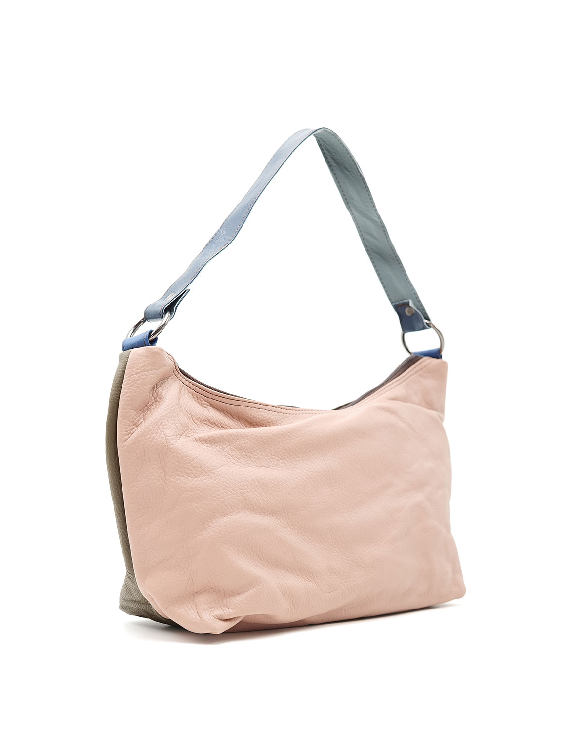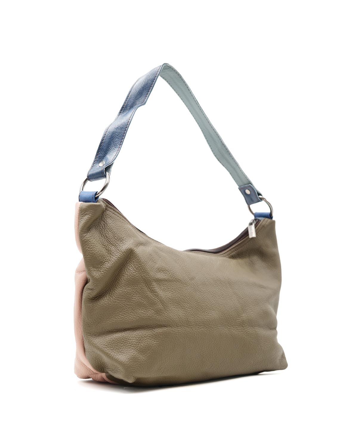 100% Recycled Leather Hobo-stye Shoulder Bag. Enjoy two looks in one bag: with one side in Pink shades and the other in Olive Green. Beautiful eco-friendly handmade bag.
