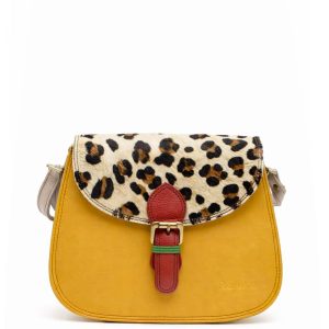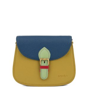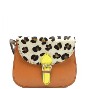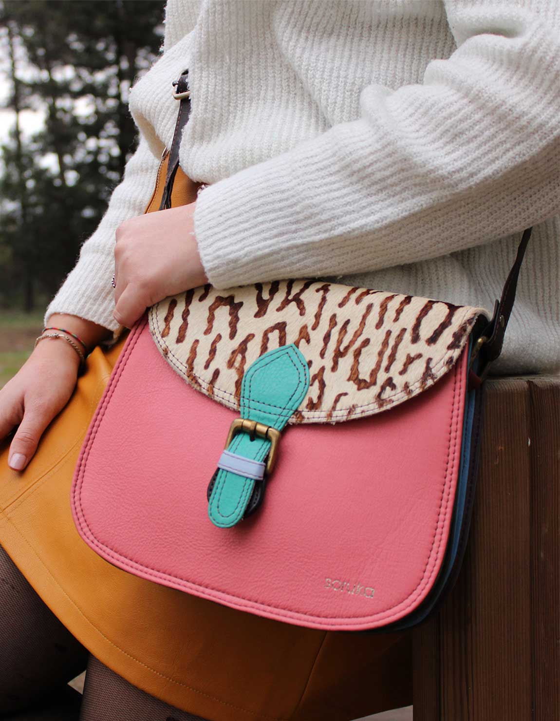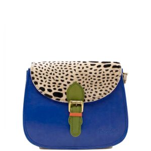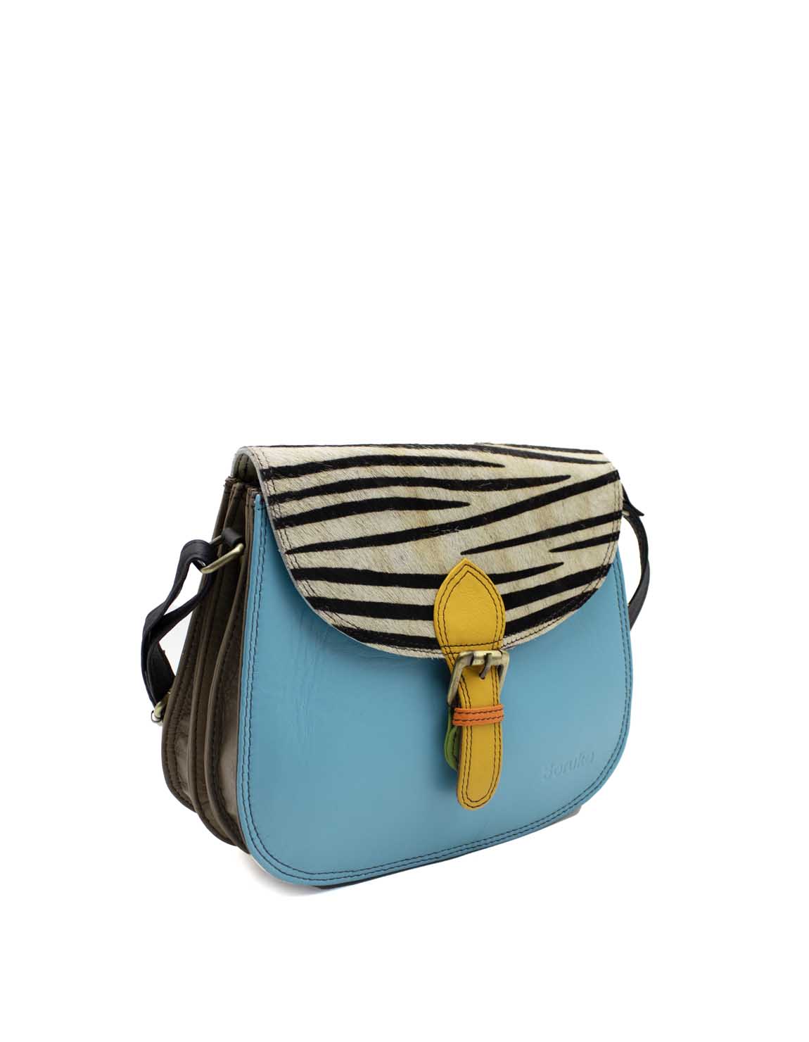 Stay stylish and organized with this handcrafted recycled leather crossbody bag, designed for maximum functionality, in Shades of Light Blue and Animal Print. With three separate compartments, it keeps your essentials neatly sorted while adding a touch of sustainable fashion to your outfit.