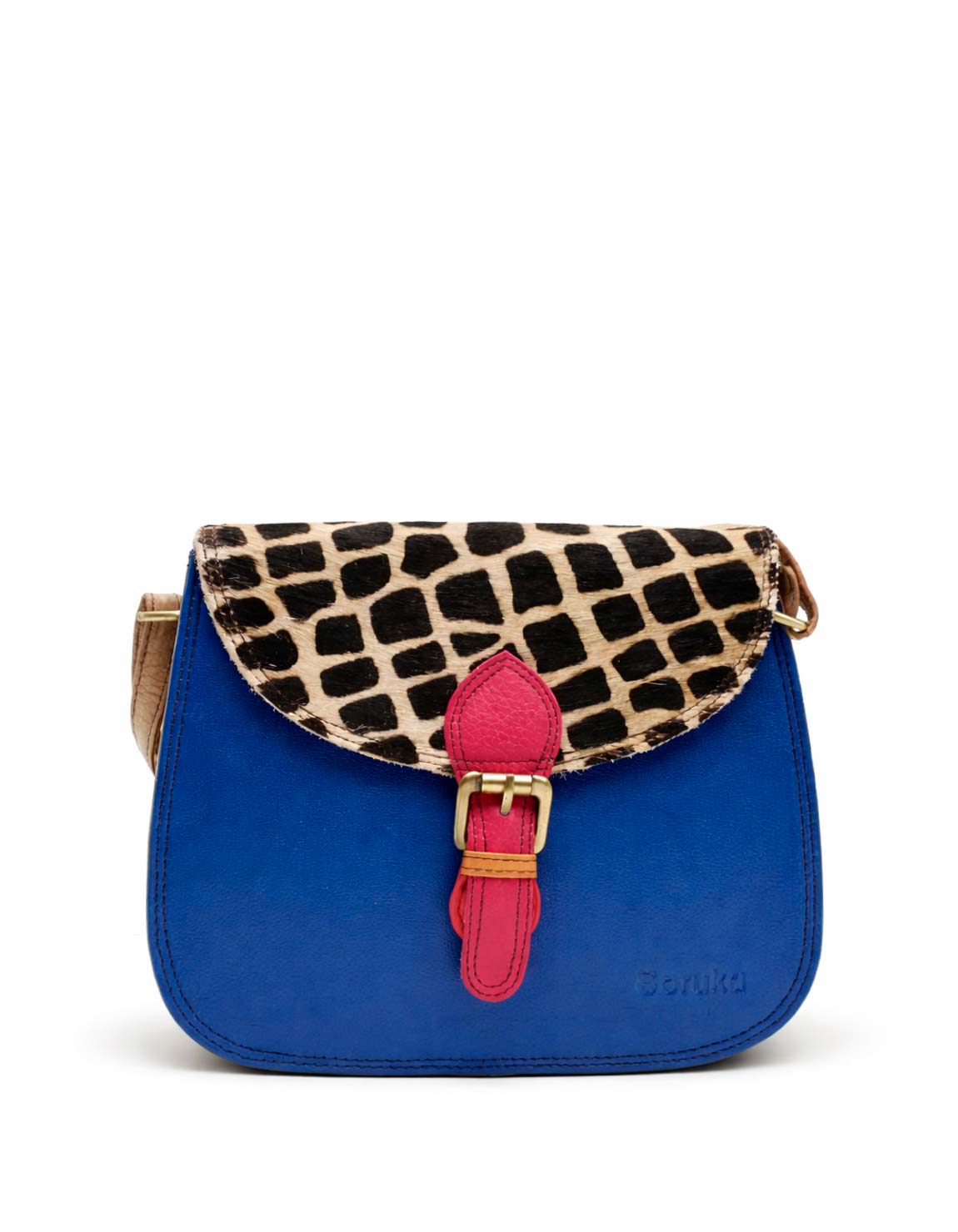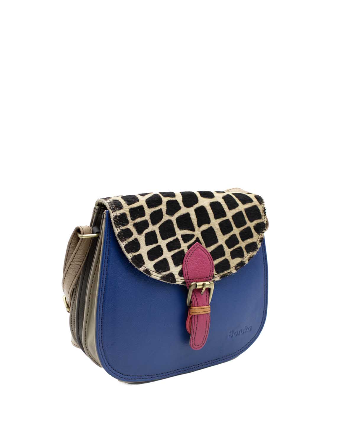 Stay stylish and organized with this handcrafted recycled leather crossbody bag, designed for maximum functionality, in Shades of Dark Blue and Animal Print. With three separate compartments, it keeps your essentials neatly sorted while adding a touch of sustainable fashion to your outfit.