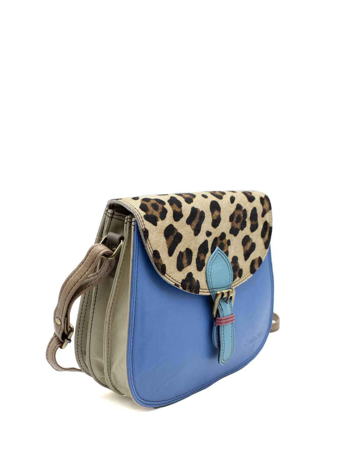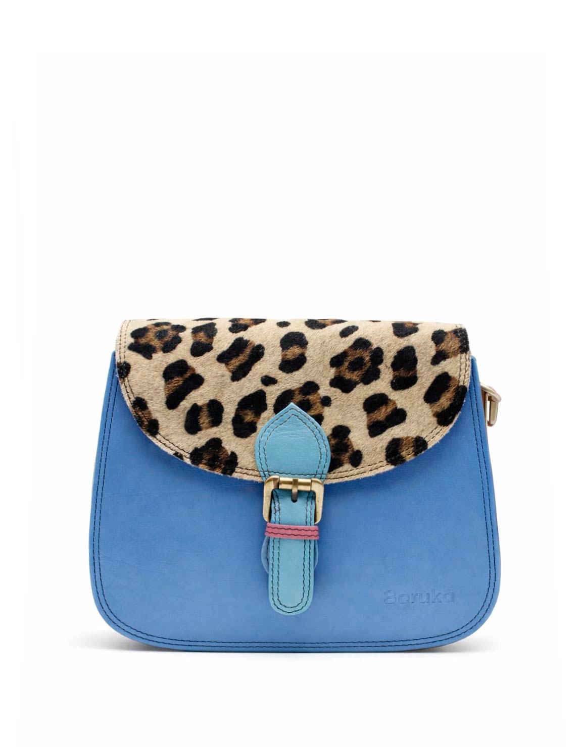Stay stylish and organized with this handcrafted recycled leather crossbody bag, designed for maximum functionality, in Shades of Dark Blue and Animal Print. With three separate compartments, it keeps your essentials neatly sorted while adding a touch of sustainable fashion to your outfit.