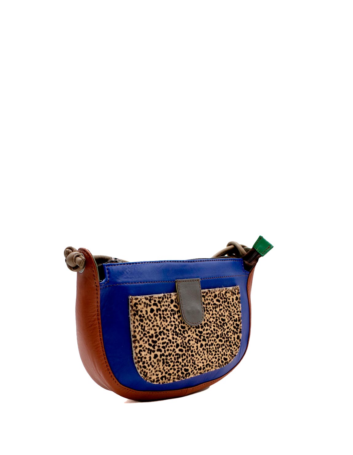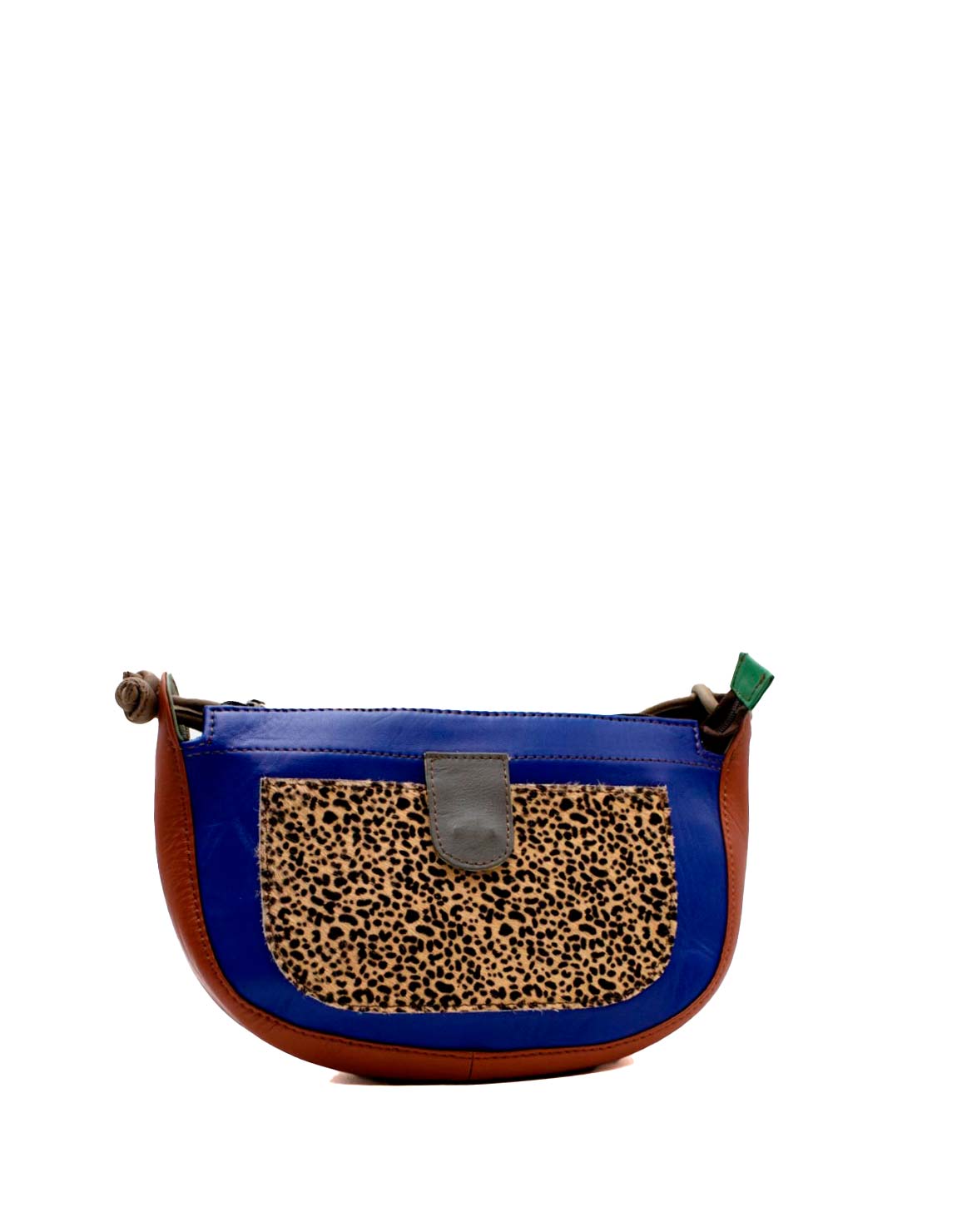 Beautiful 100% Recycled Leather Shoulder Bag. Eco-friendly Handmade Bag in shades of Blue and with animal print in the front pocket.