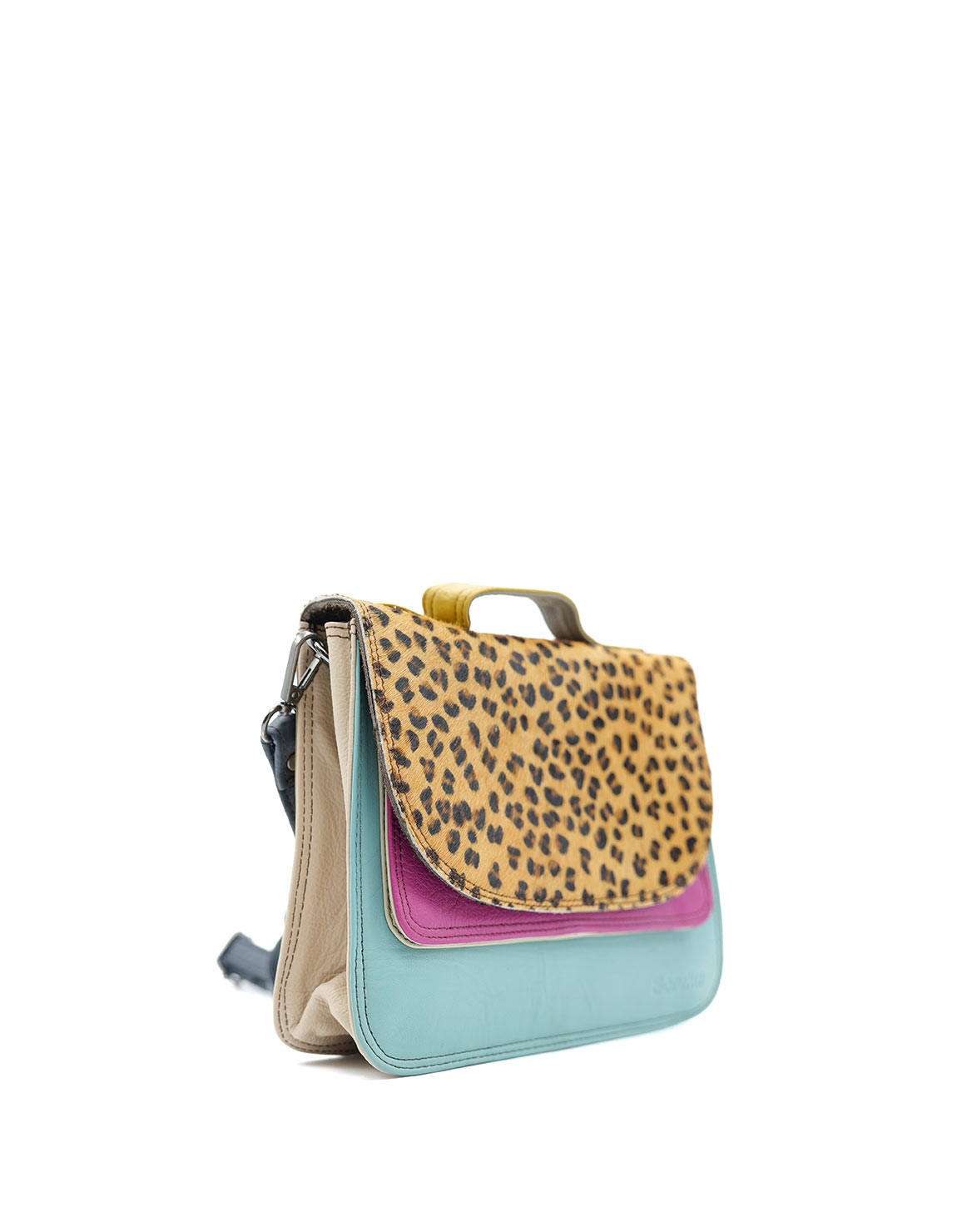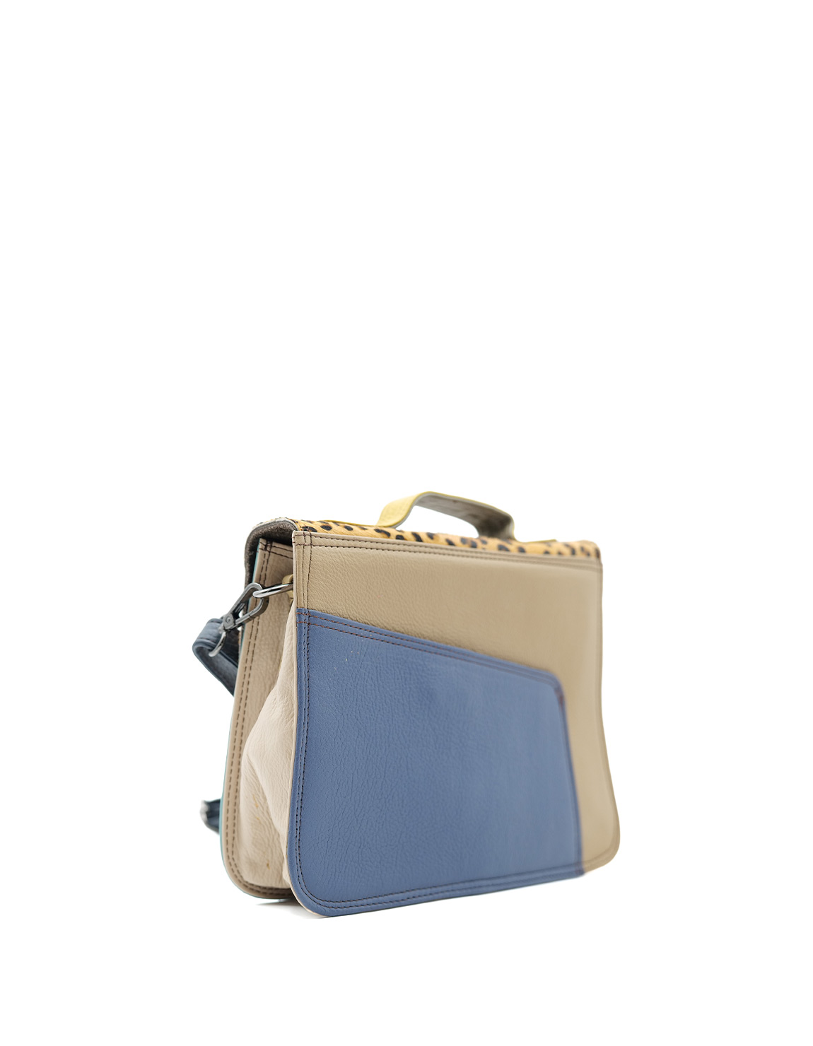Add a touch of eco-friendly style to your wardrobe with this handcrafted recycled leather crossboduy bag. Designed in vibrant Blue and Animal Print hues, its saddle-shaped silhouette makes it a standout piece that complements any look. Perfectly sized to carry your essentials, this versatile bag can be worn as a handbag or crossbody for effortless everyday wear.