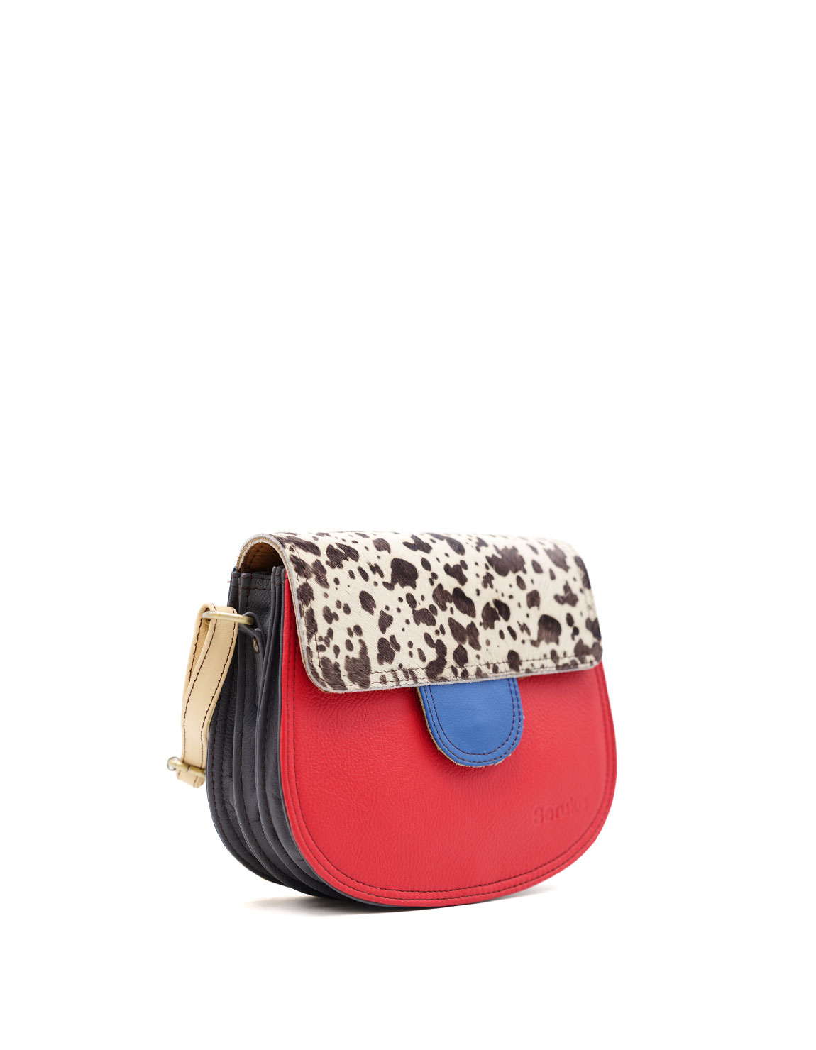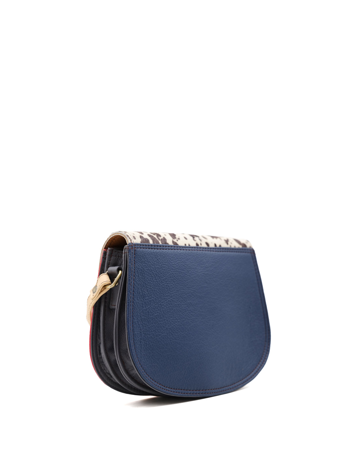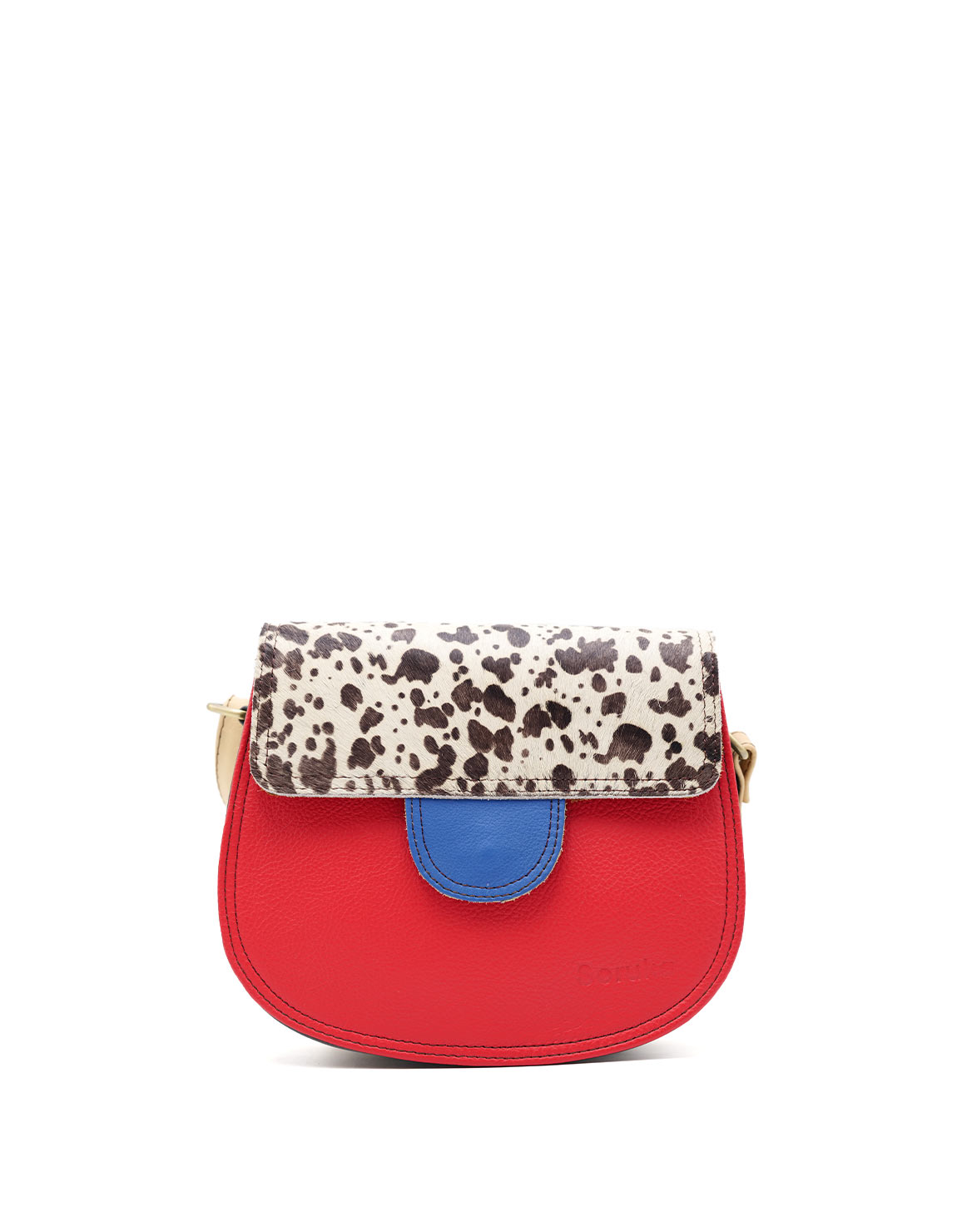 This colorful small saddle-shaped bag is unique and complements all types of looks. It comes with three internal compartments, one with a zipper. Additional pocket zipper on the inside.