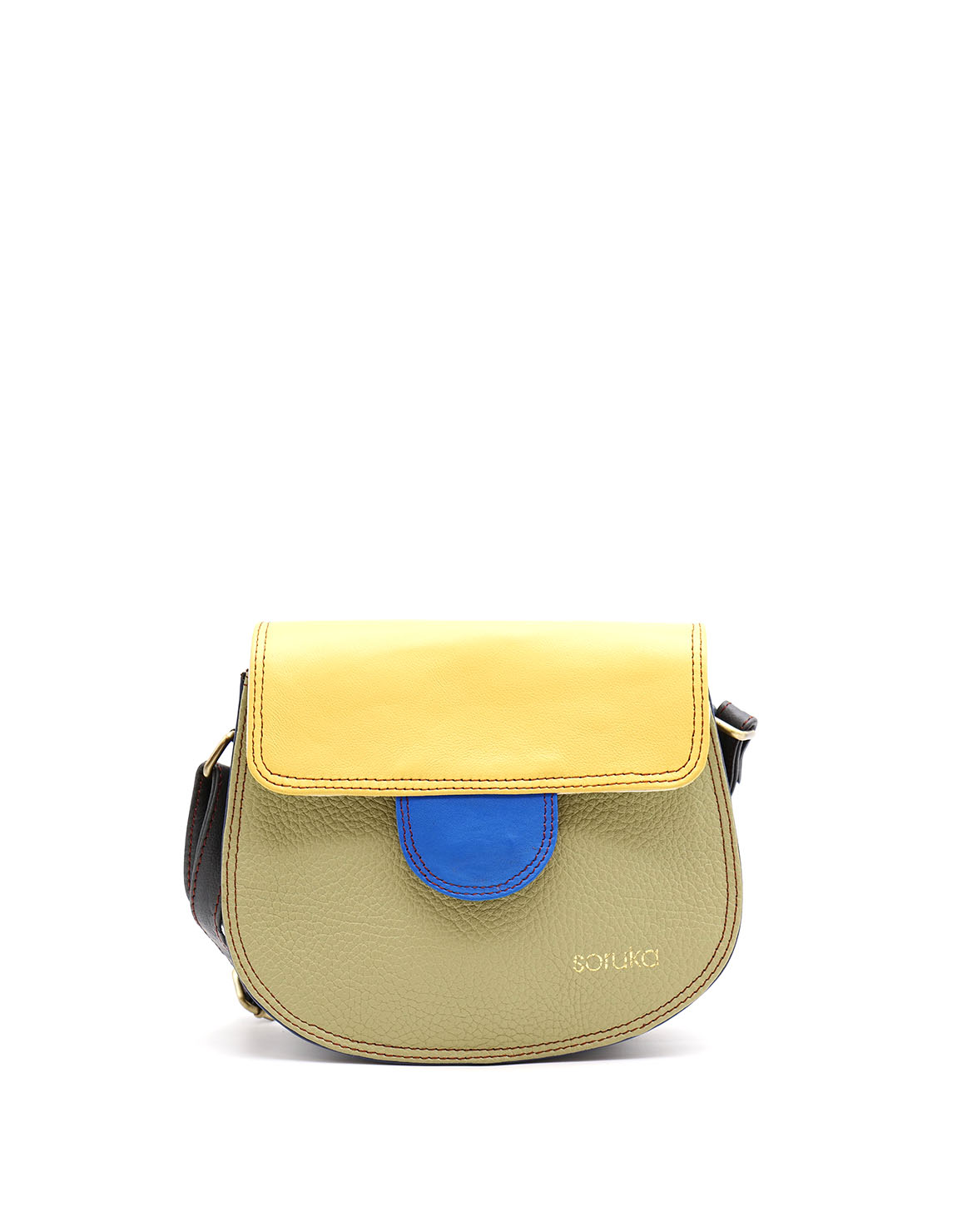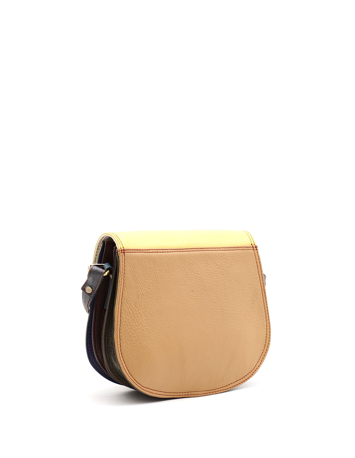 This colorful small saddle-shaped bag is unique and complements all types of looks. It comes with three internal compartments, one with a zipper. Additional pocket zipper on the inside.