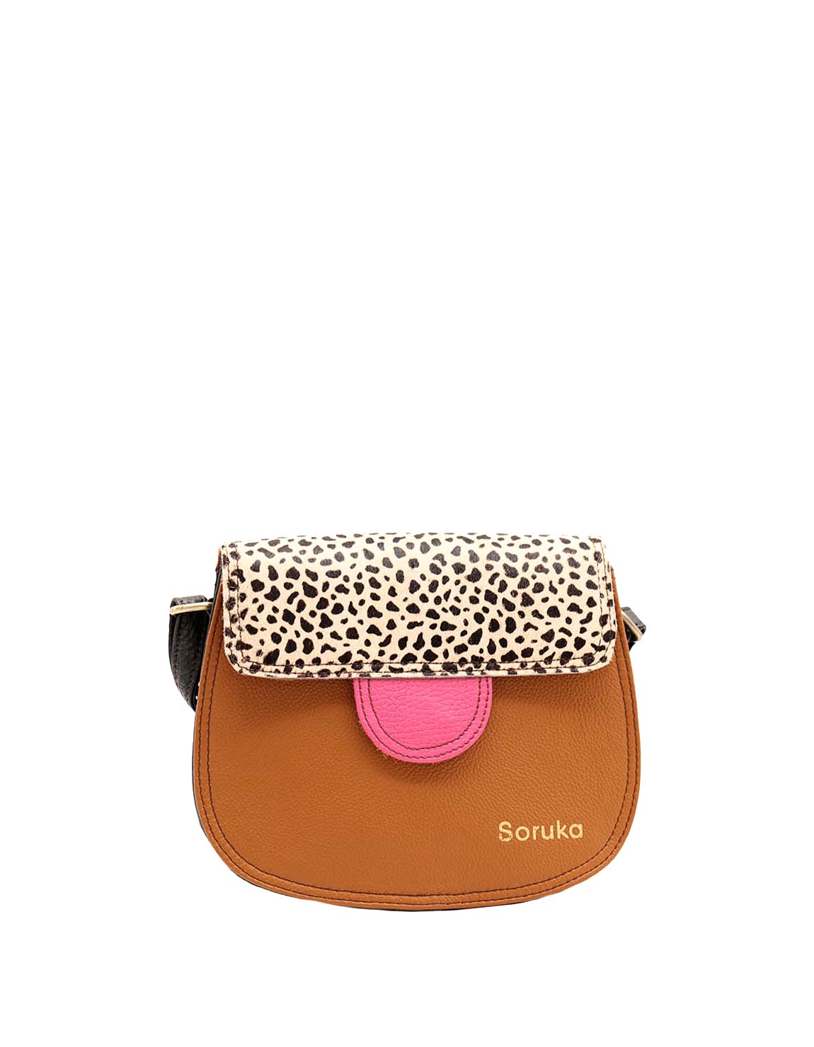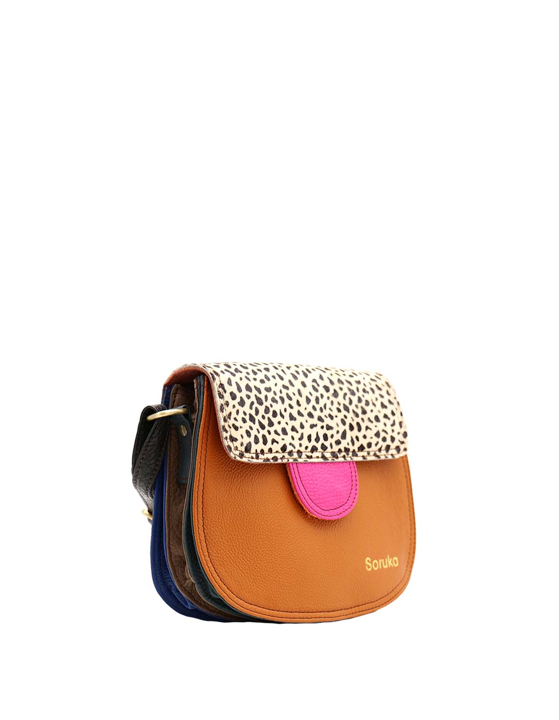 This colorful small saddle-shaped bag is unique and complements all types of looks. It comes with three internal compartments, one with a zipper. Additional pocket zipper on the inside.