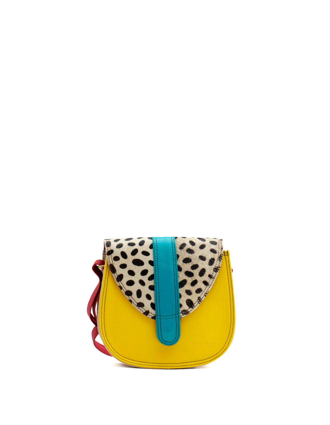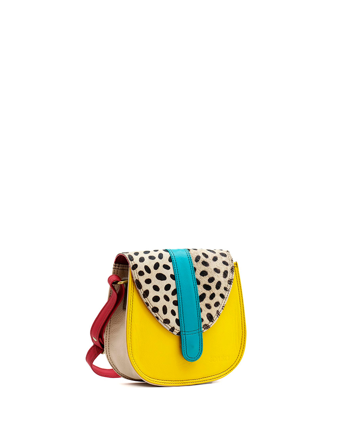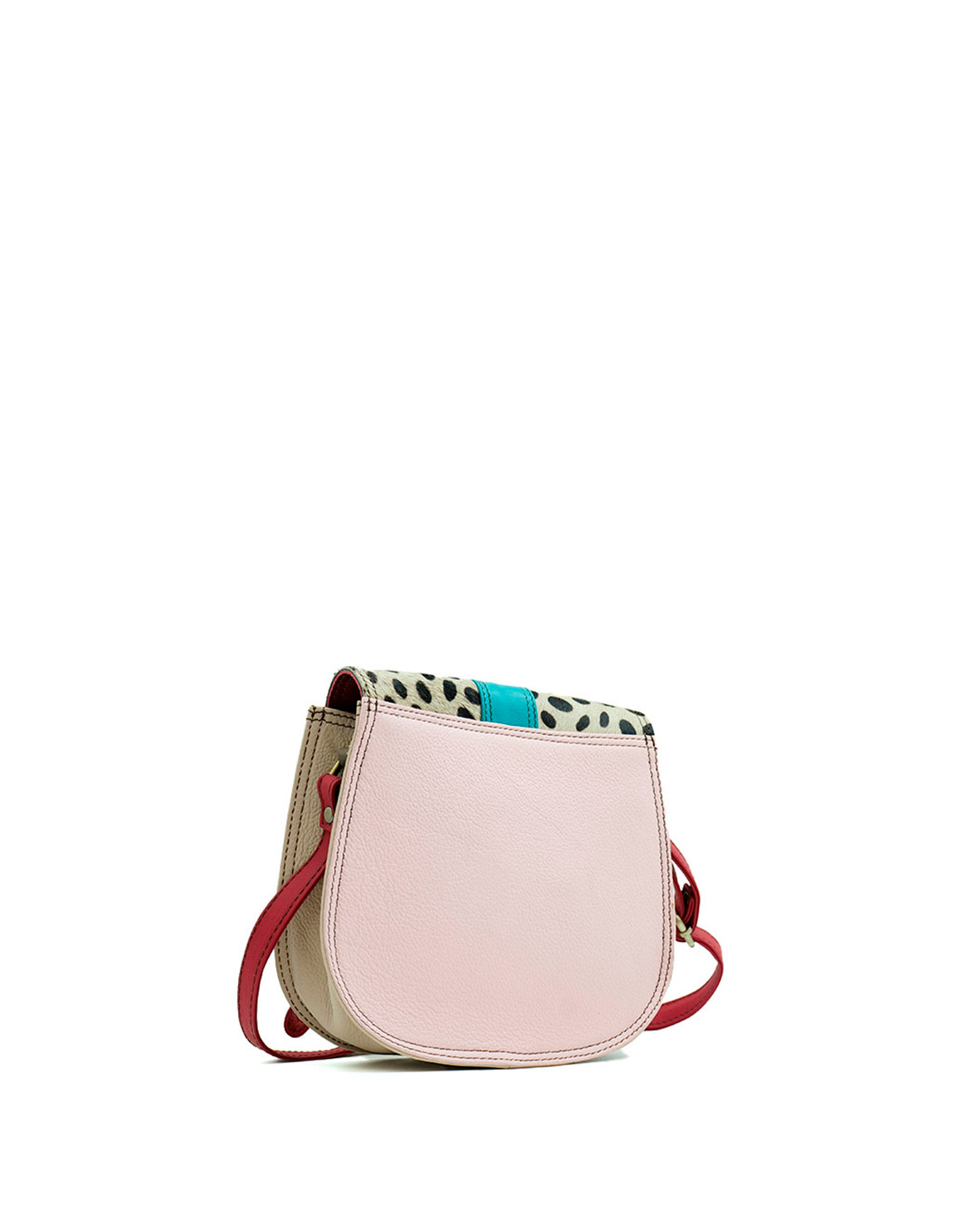 This colorful small saddle-shaped bag is unique and compliments all types of looks. The bag comes with an adjustable long strap so it can be worn as a shoulder bag or crossbody. It fastens with a magnetic stud beneath the buckle. Additional pocket zipper inside the main compartment.
