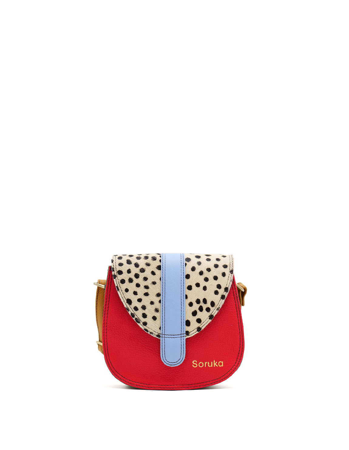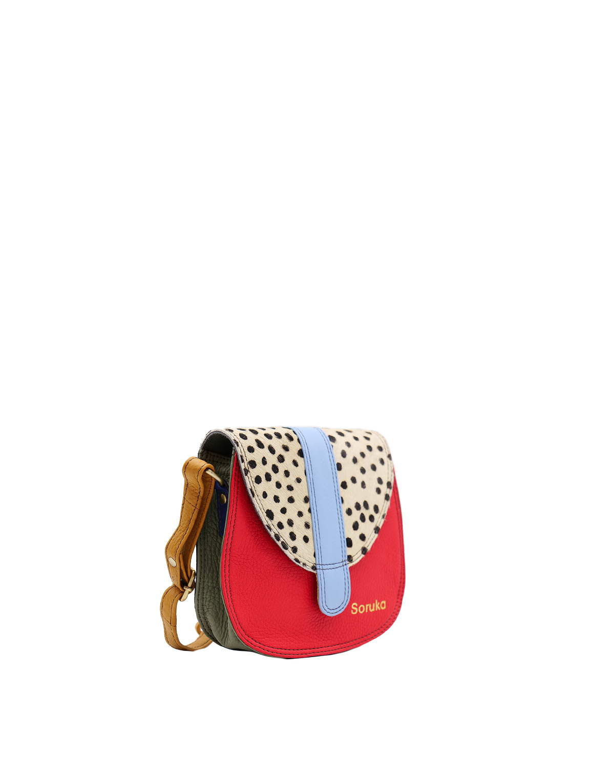 This colorful small saddle-shaped bag is unique and compliments all types of looks. The bag comes with an adjustable long strap so it can be worn as a shoulder bag or crossbody. It fastens with a magnetic stud beneath the buckle. Additional pocket zipper inside the main compartment.