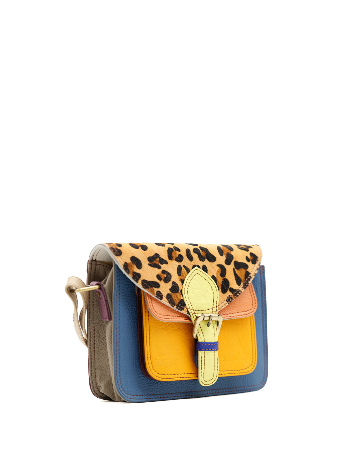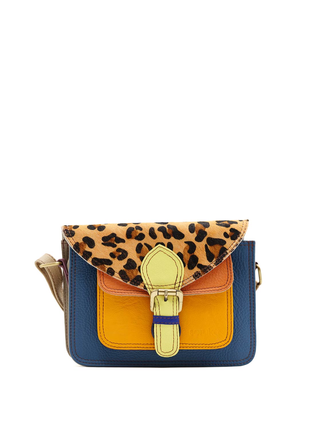 Beautiful 100% Recycled Leather Crossbody / Shoulder Bag. Eco-friendly Handmade Bag in Shades of Blue, Yellow and with Animal Print flap.