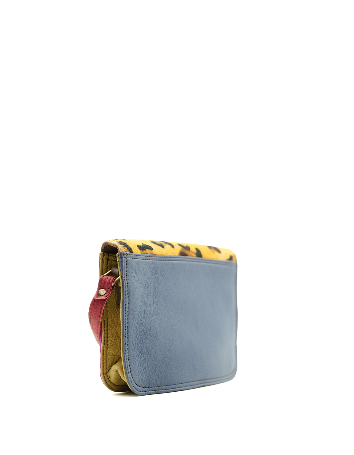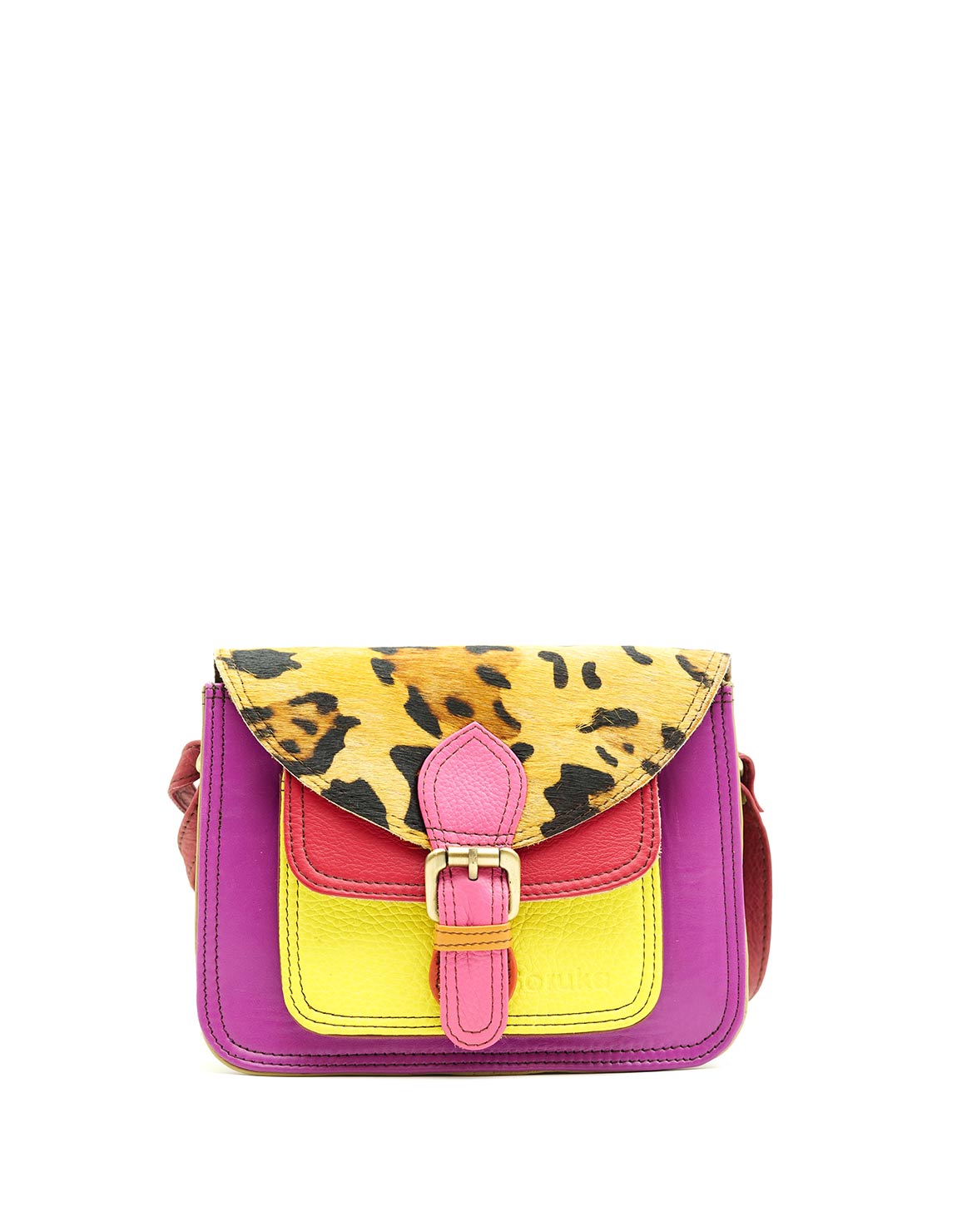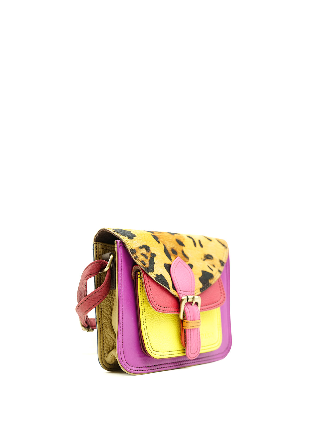 Beautiful 100% Recycled Leather Crossbody / Shoulder Bag. Eco-friendly Handmade Bag in Shades of Pink, Yellow and with Animal print flap.