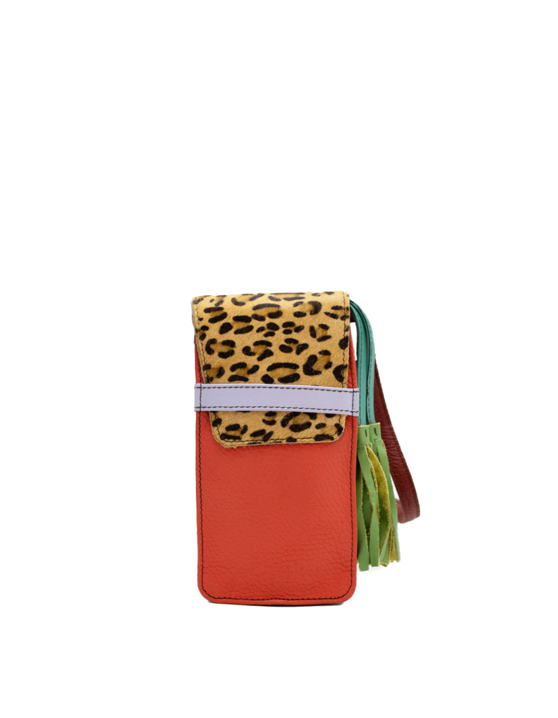 Recycled Leather Phone Bag with Animal Print and in Shades of Red. Beautiful Handcrafted Eco-Friendly Purse made with Upcycled Leather.