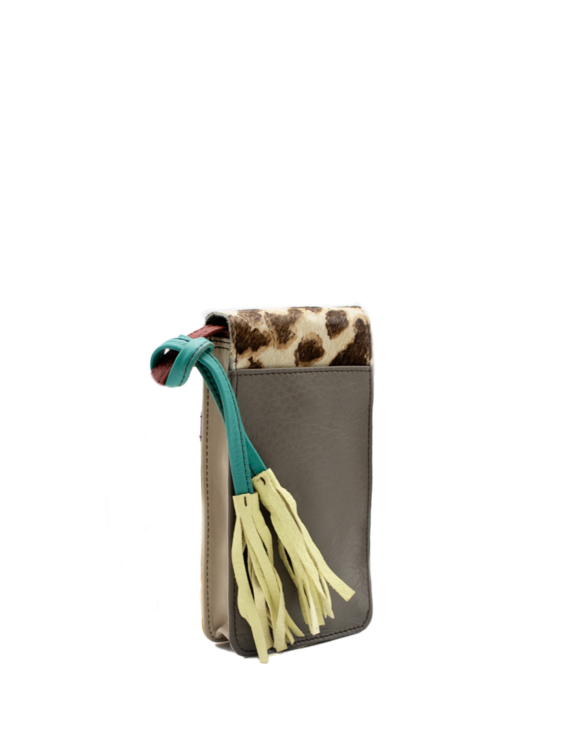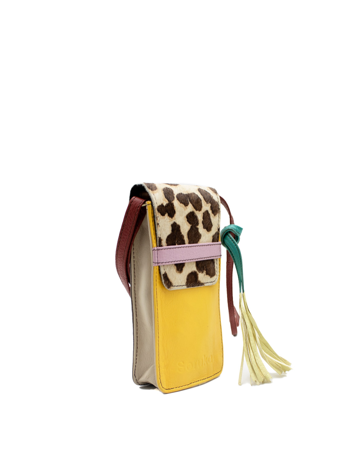 Recycled Leather Phone Bag with Animal Print and in Shades of Yellow. Beautiful Handcrafted Eco-Friendly Purse made with Upcycled Leather.