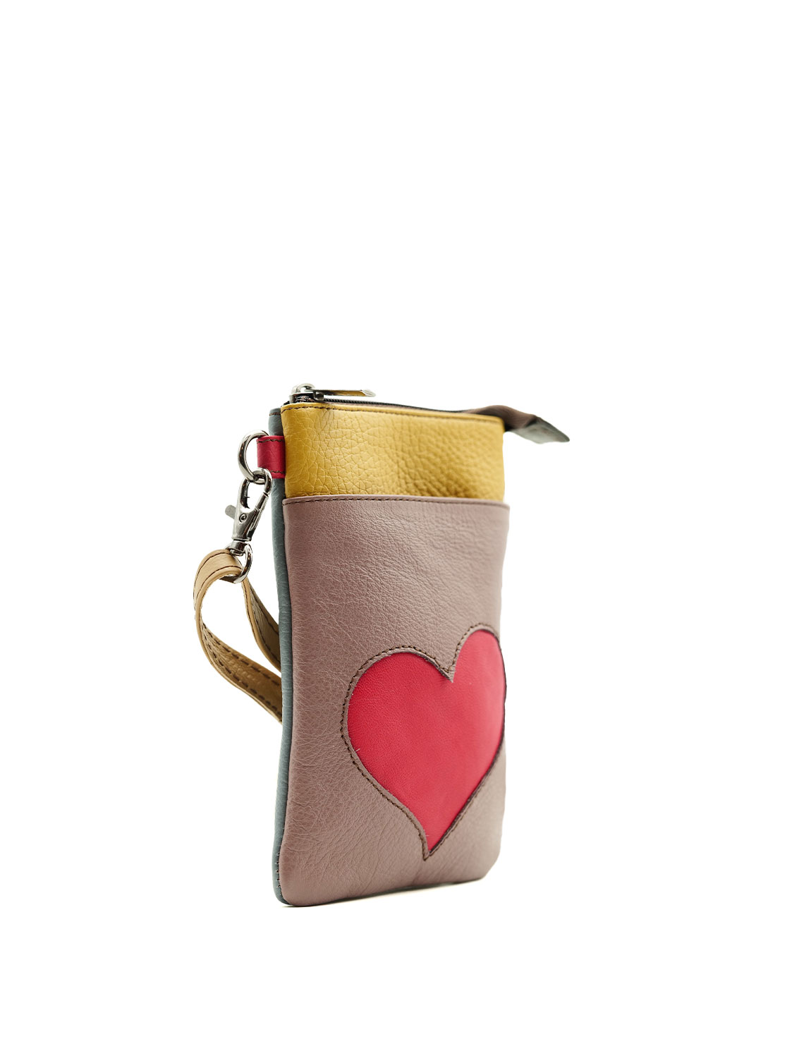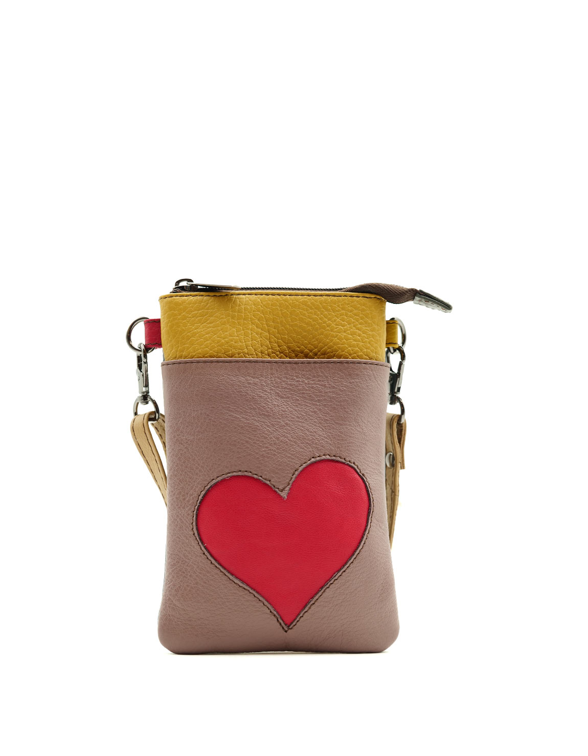 Beautiful 100% Recycled Leather Crossbody Phone Bag. Eco-friendly handmade pouch for mobile phone in shades of Pink with a Heart shape on the front.
