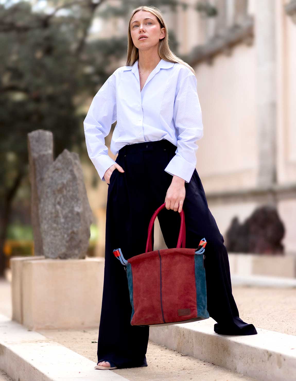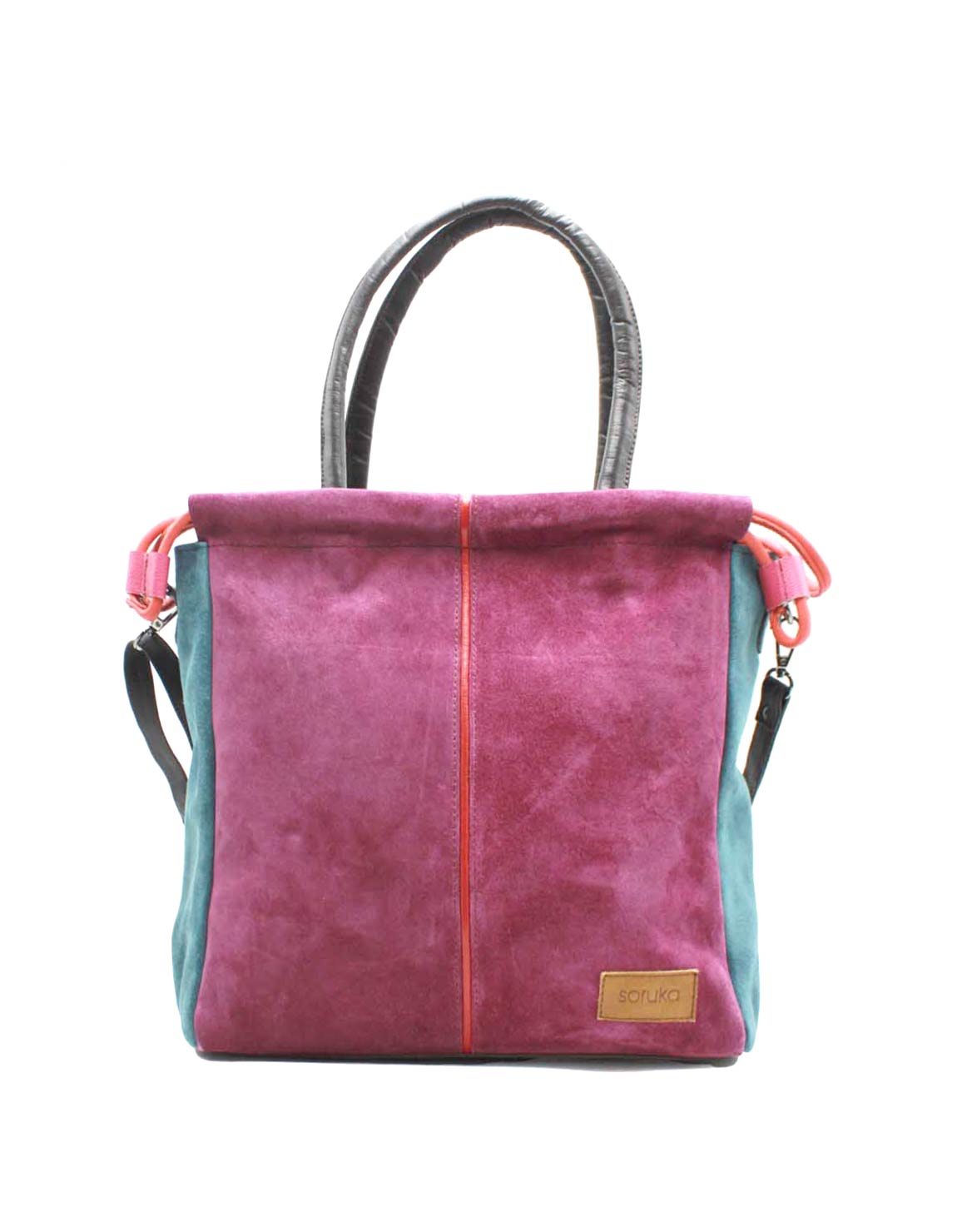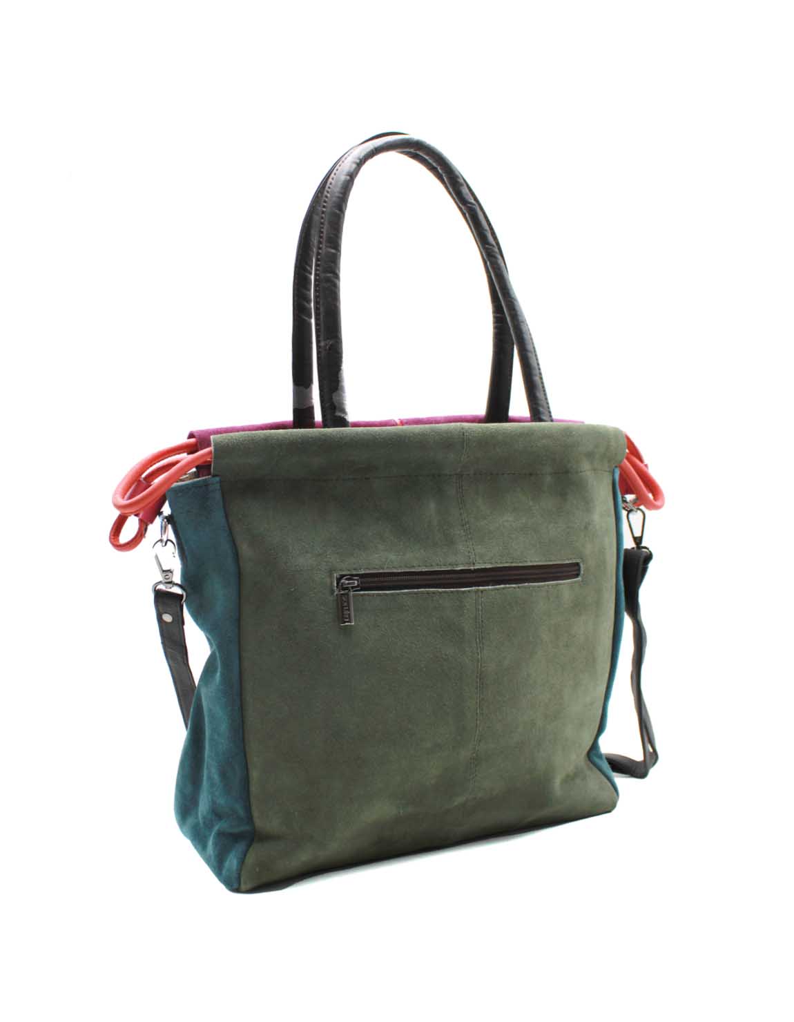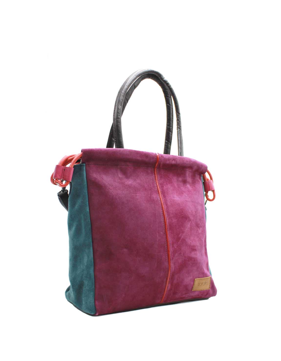 Women’s shoulder bag · Two-tone recycled leather · Handmade · Double handles and adjustable shoulder strap · Suede Leahter