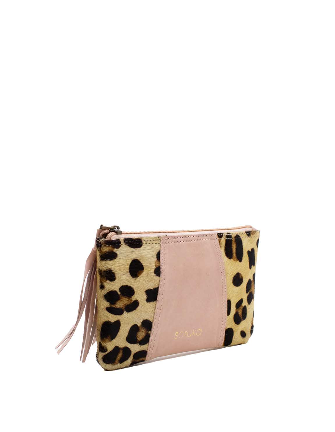 The pouch contains a main department that includes 3 credit card slots and an inside zipper coin pocket. It fastens with a zipper strap with a leather ornament for easy opening.
