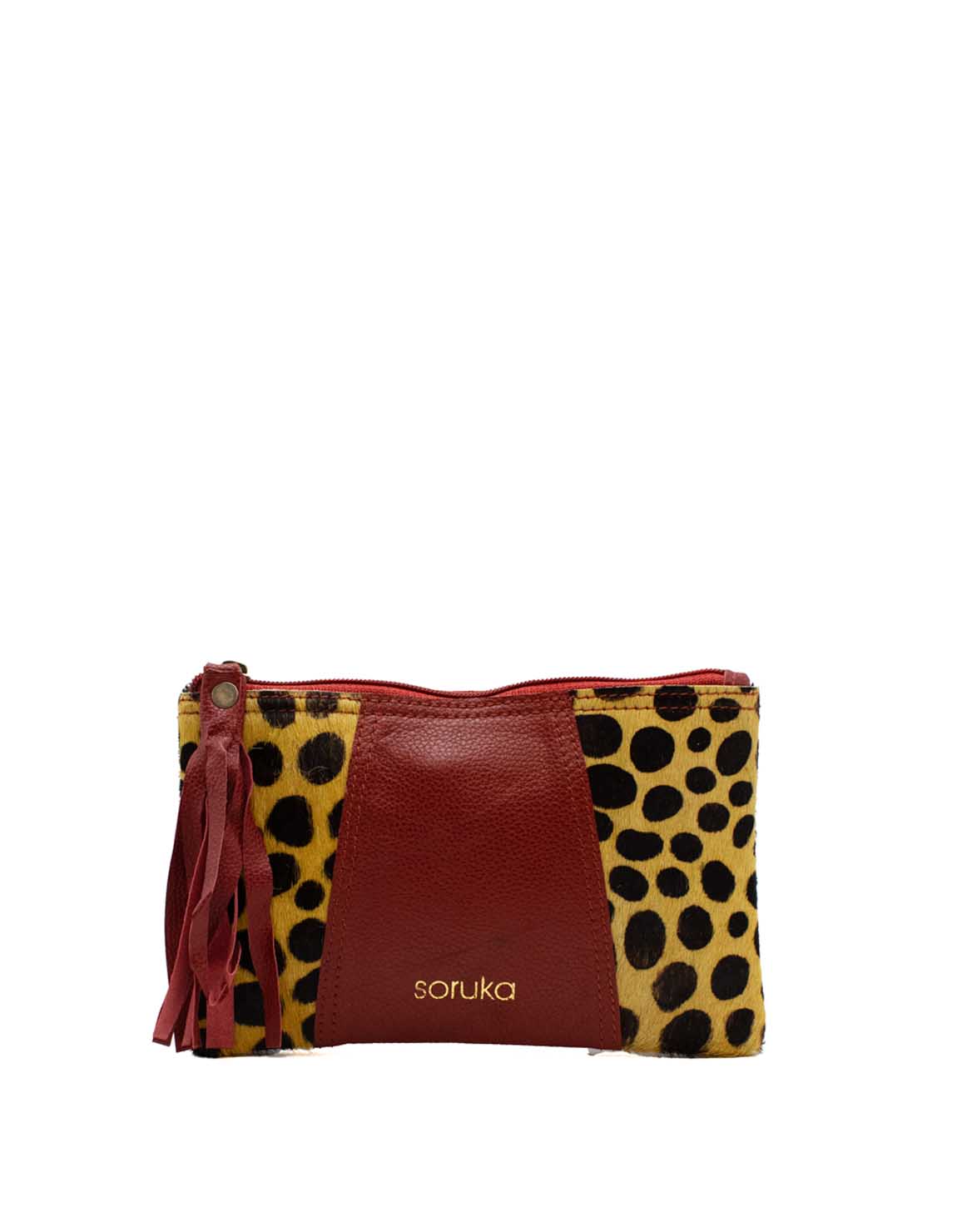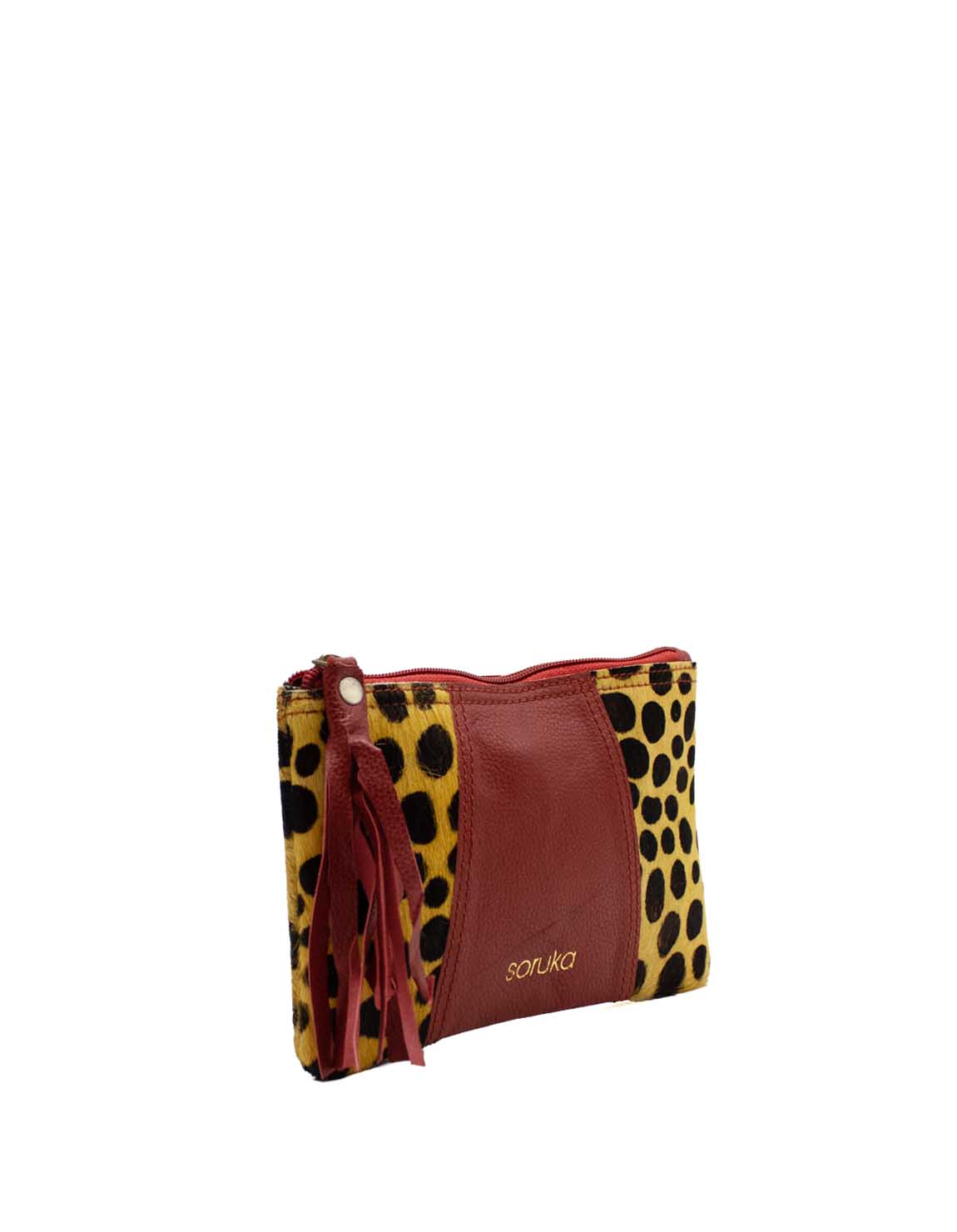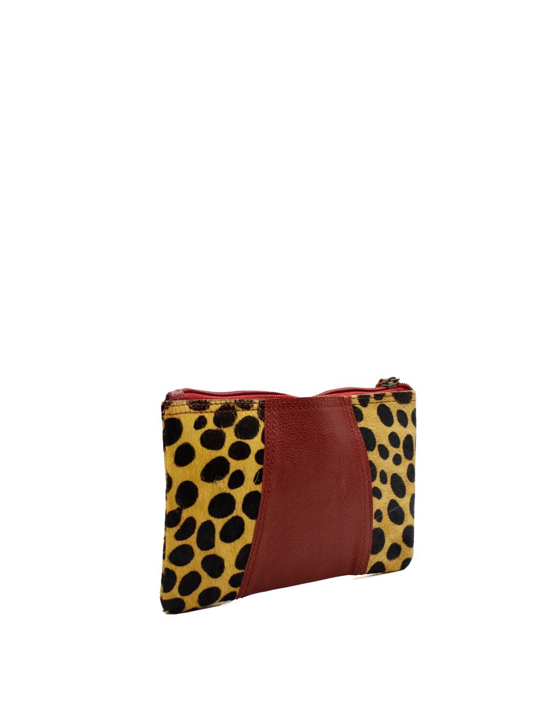 The pouch contains a main department that includes 3 credit card slots and an inside zipper coin pocket. It fastens with a zipper strap with a leather ornament for easy opening.