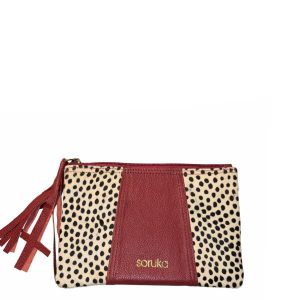 The pouch contains a main department that includes 3 credit card slots and an inside zipper coin pocket. It fastens with a zipper strap with a leather ornament for easy opening.