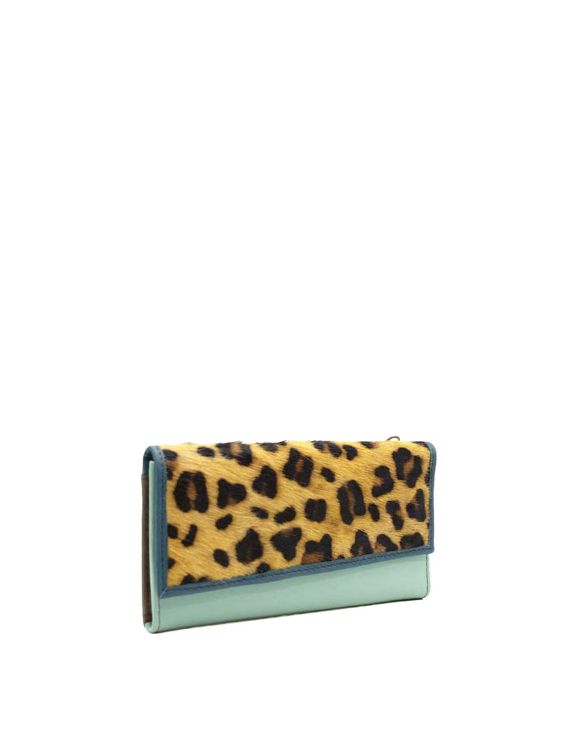 Authentic Leather Handcrafted Wallet with Animal Print on the Flap and Light Blue Color Body. Beautiful Eco-Friendly Wallet made with Recycled Leather.